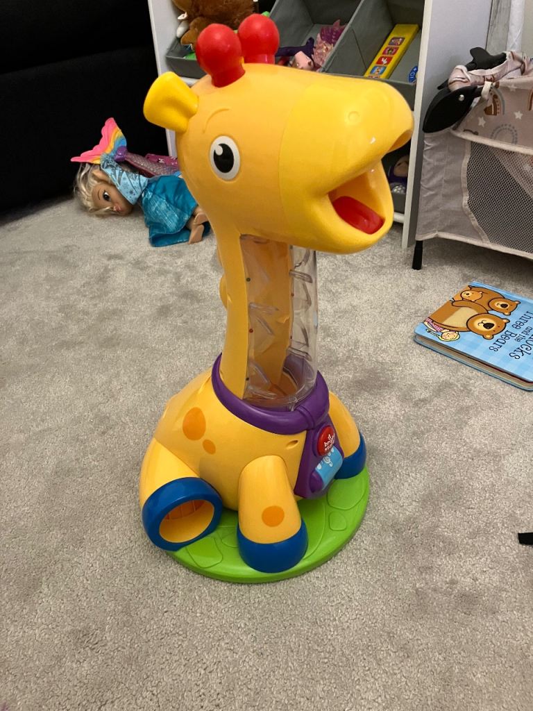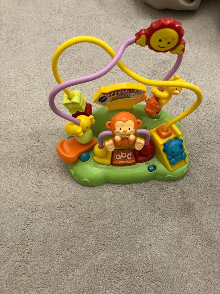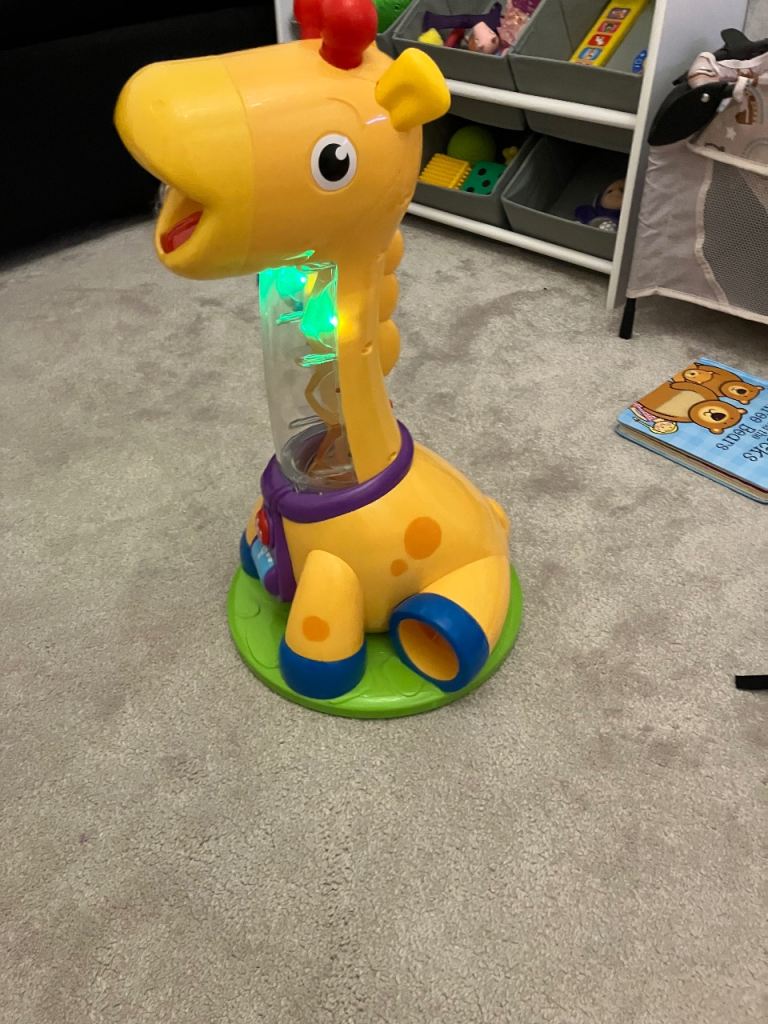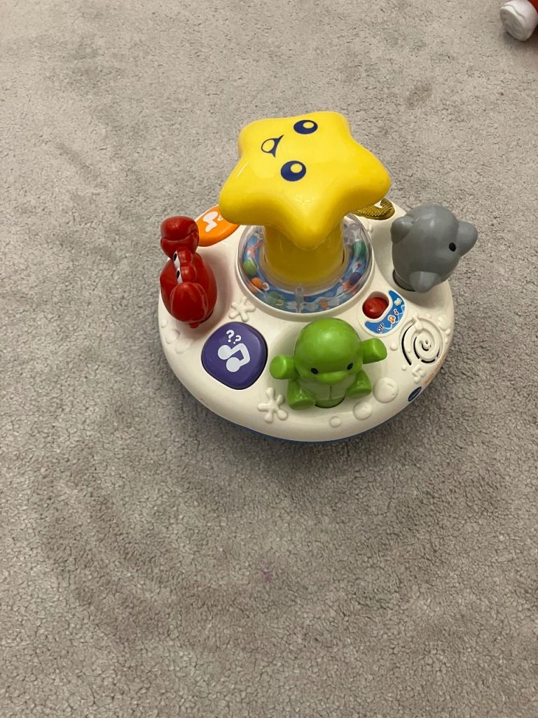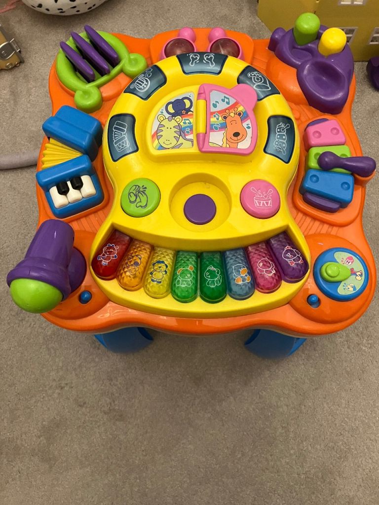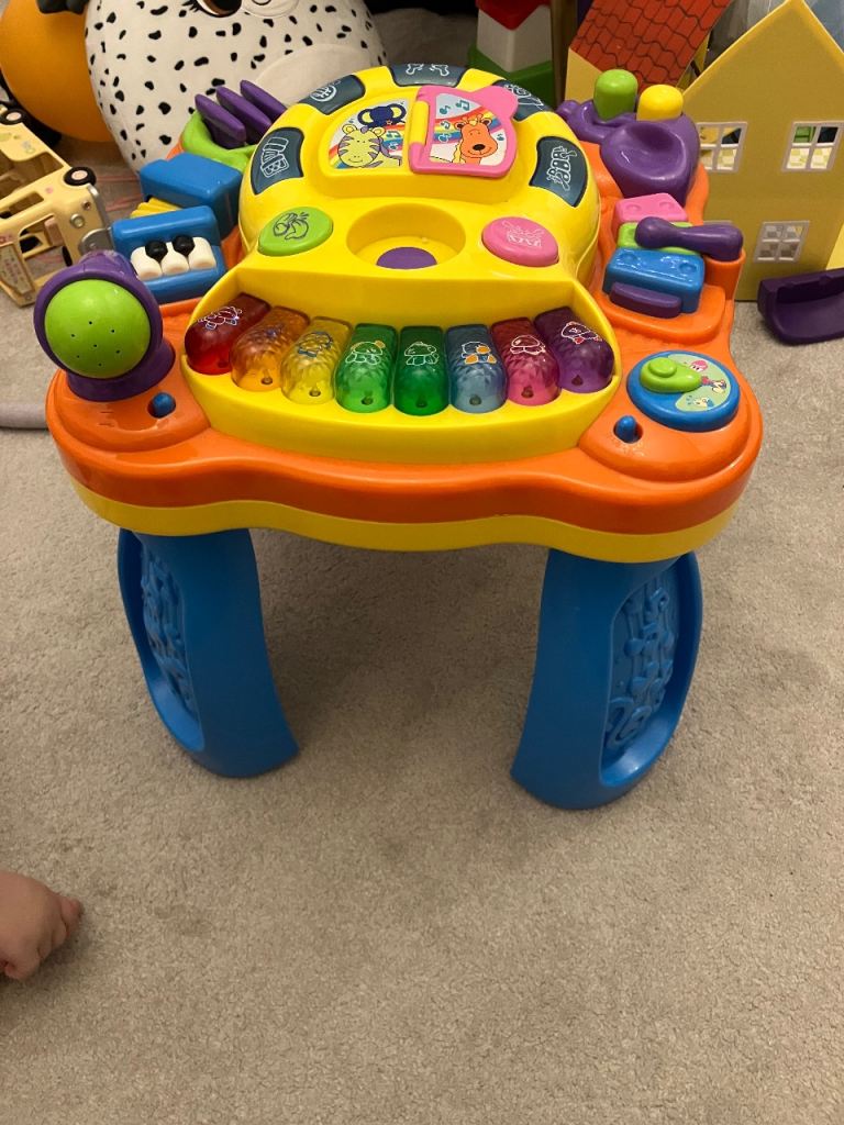 Includes a wooden shape sorter, Vtech musical table, and a giraffe drop-and-play toy.