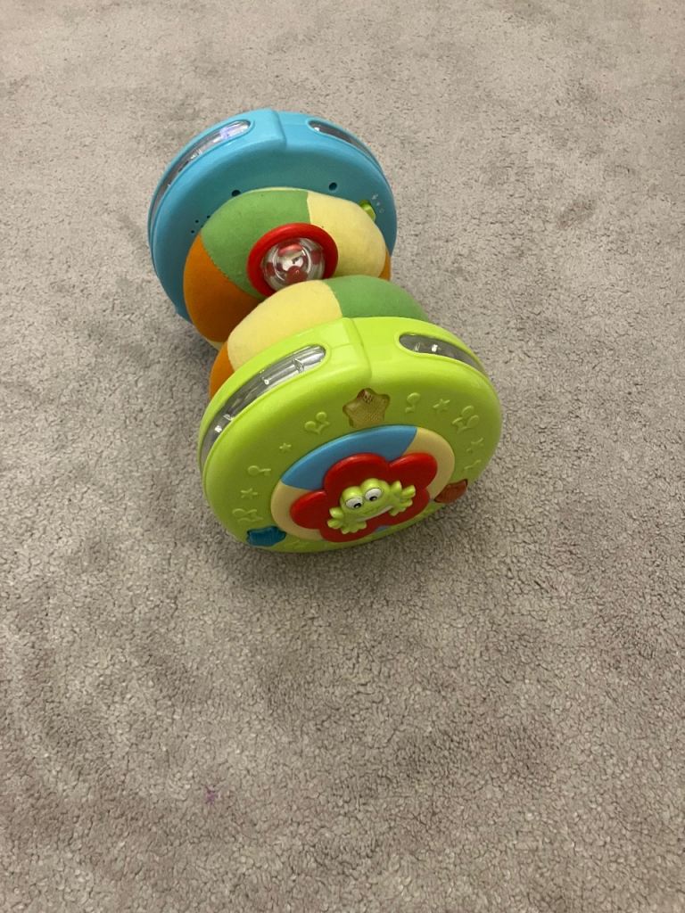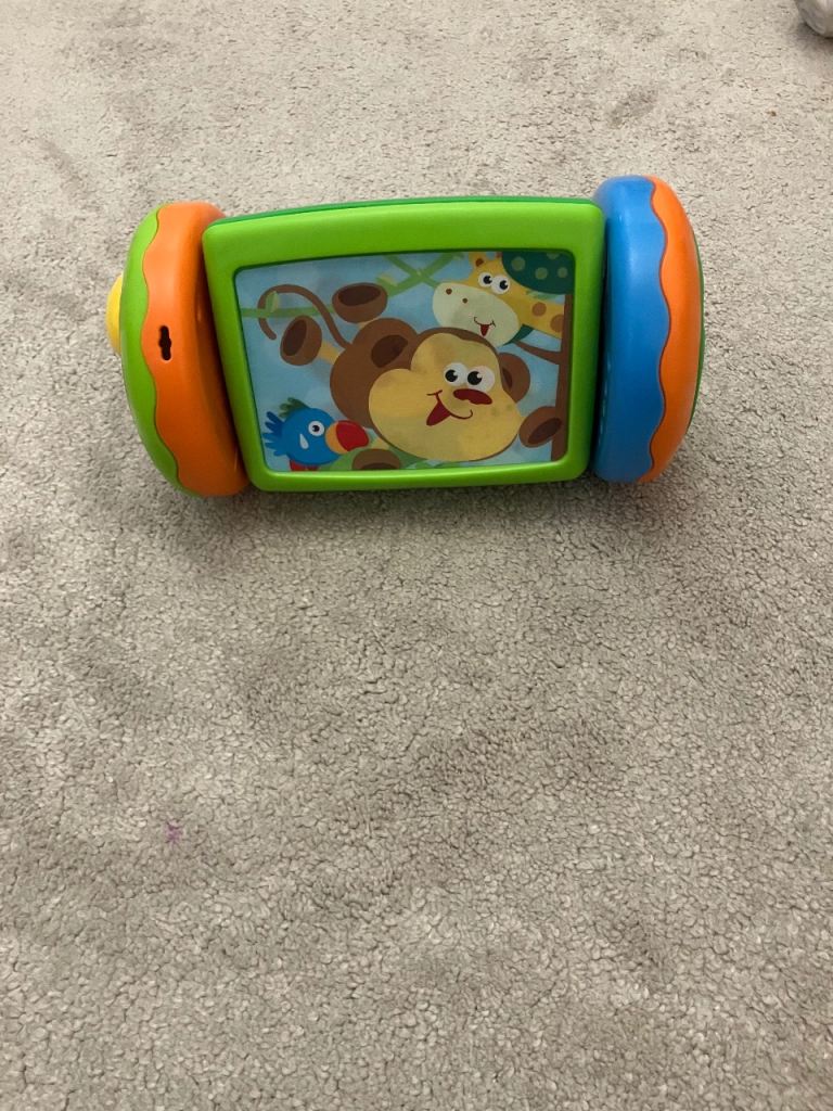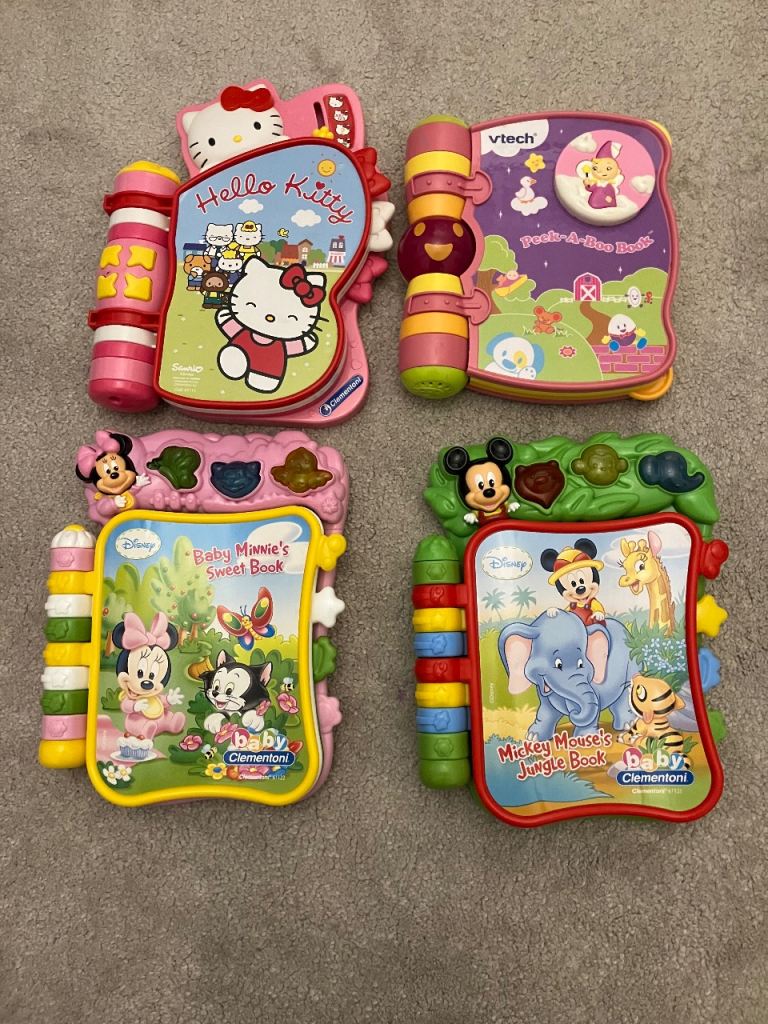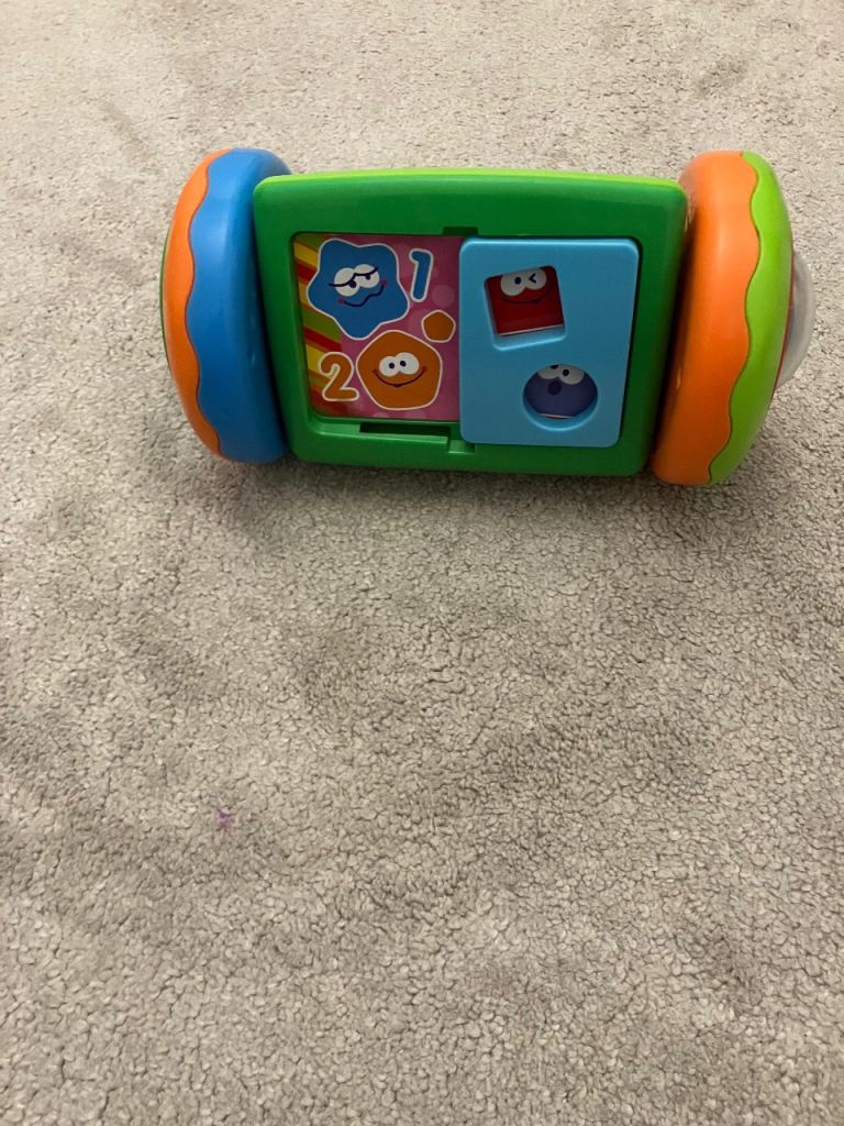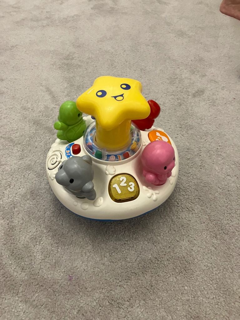 Includes a wooden shape sorter, Vtech musical table, and a giraffe drop-and-play toy.