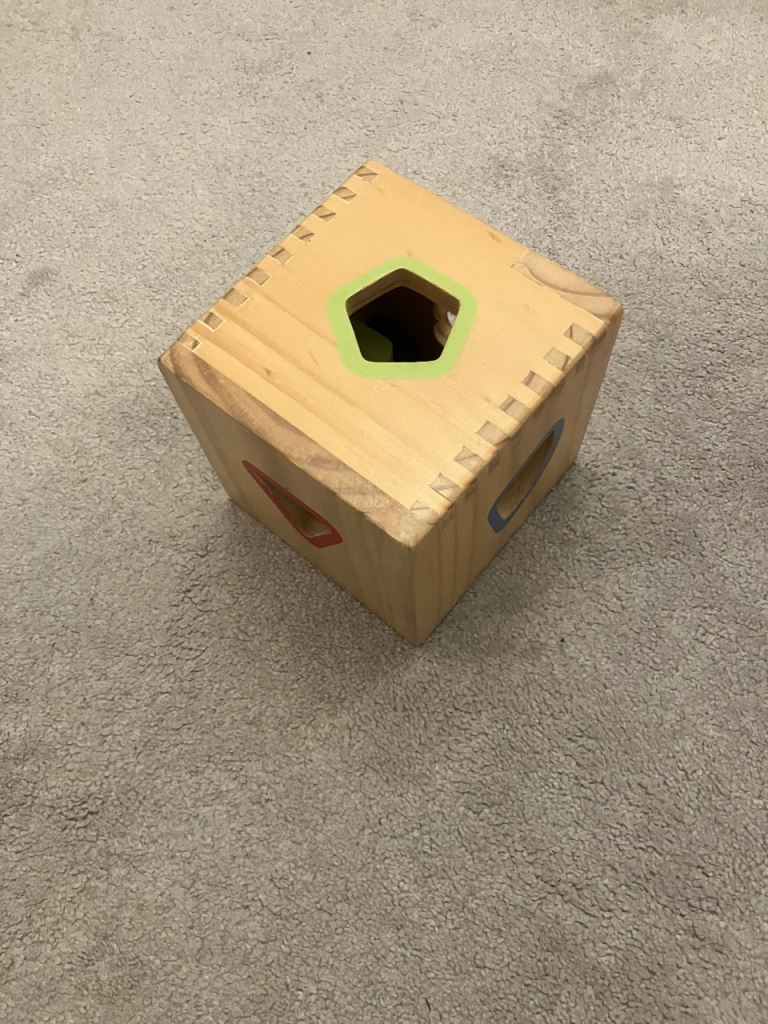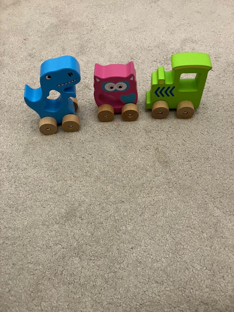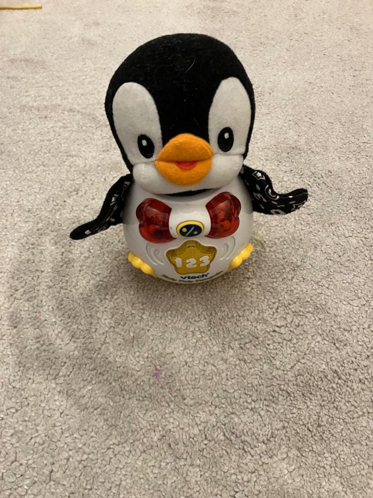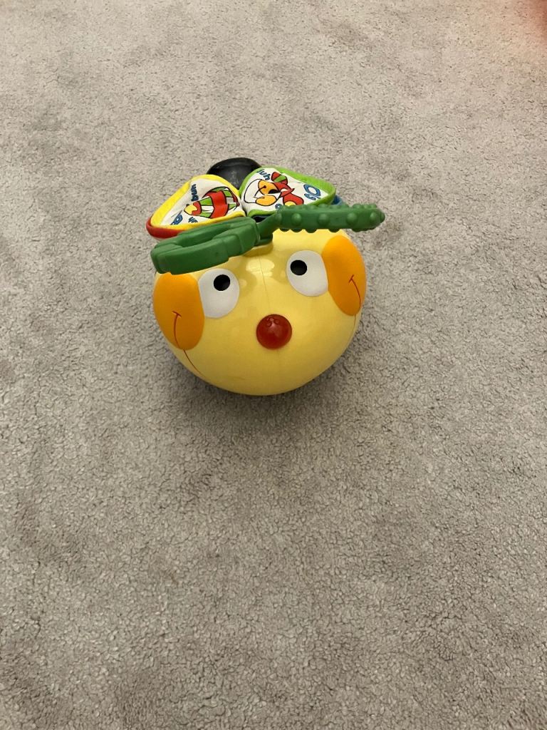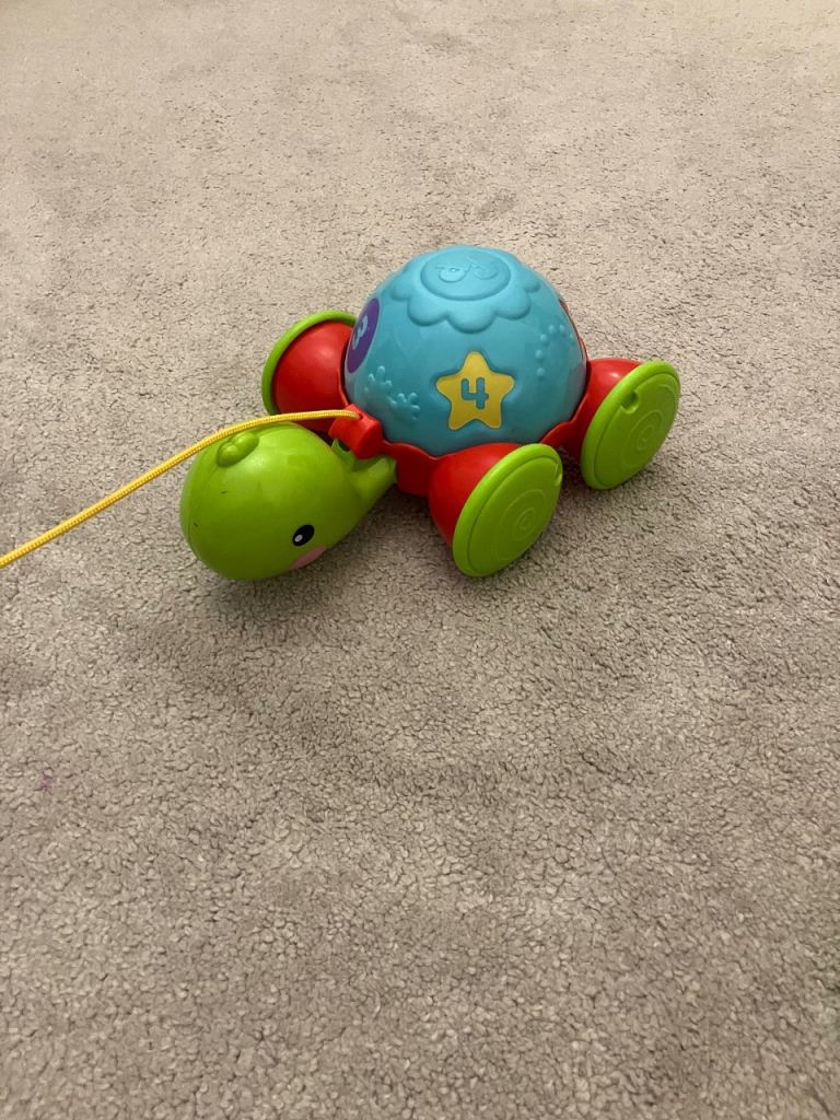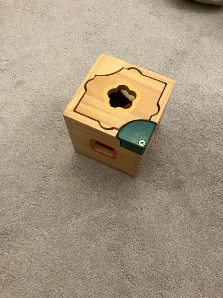 Includes a wooden shape sorter, Vtech musical table, and a giraffe drop-and-play toy.