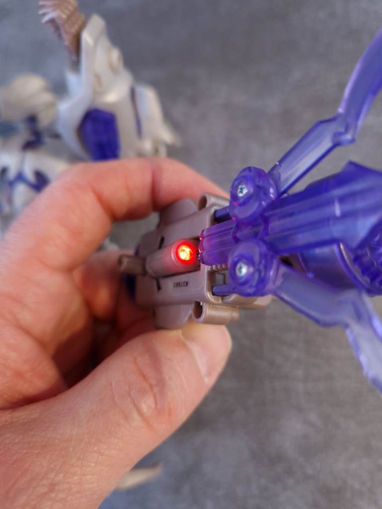 No gun, the back cannons mechanisim functions as normal with the pull-down lever but he batery terminal is missing one terminal dye to battery corrosion, and therefore, the electronics do not work.