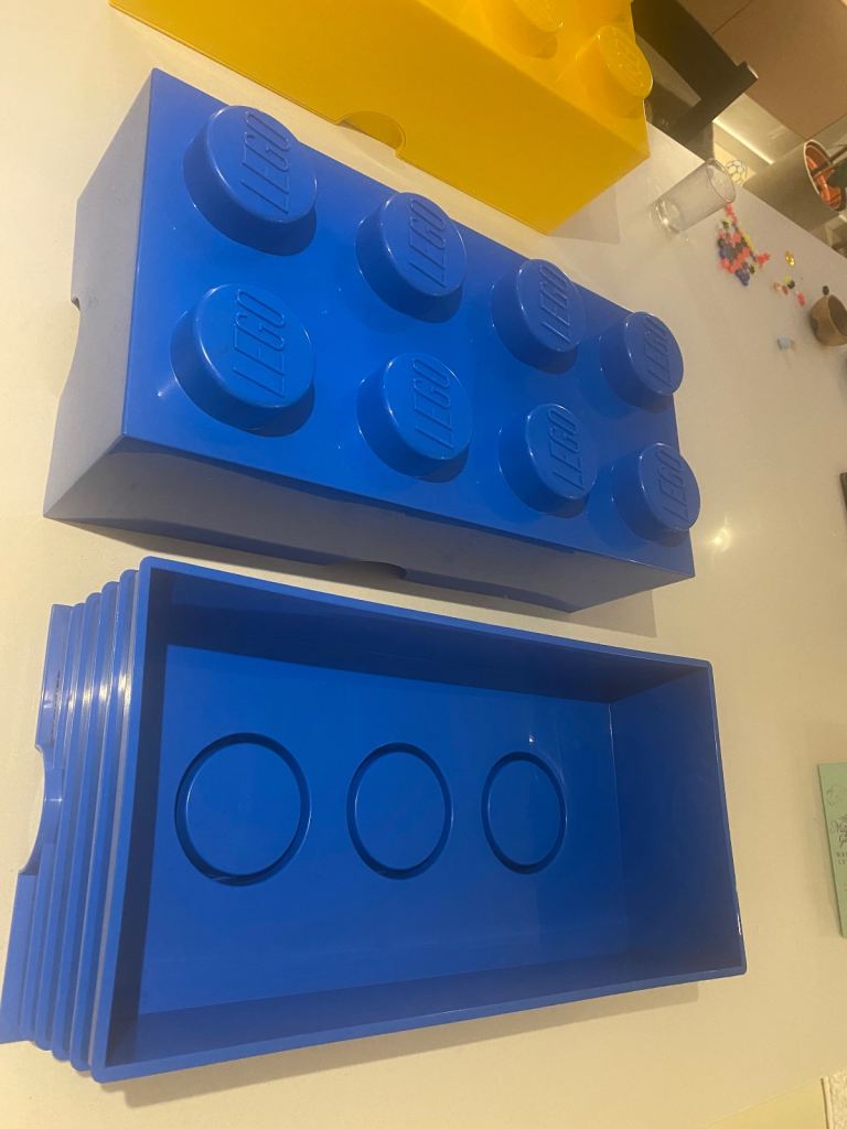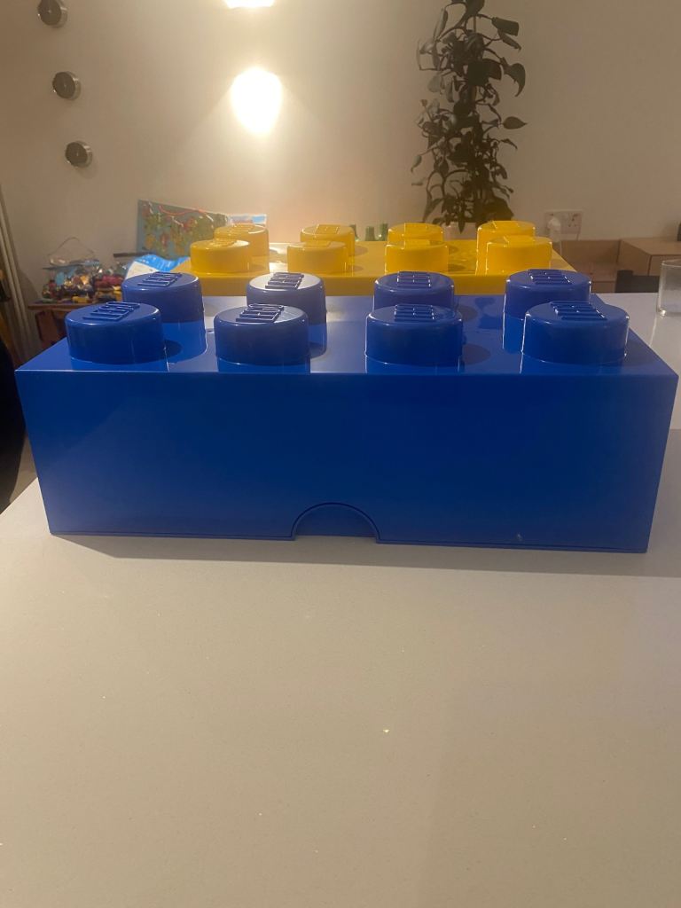 Two large LEGO storage bricks in bright blue and yellow.