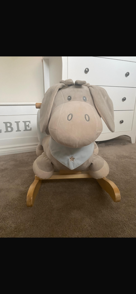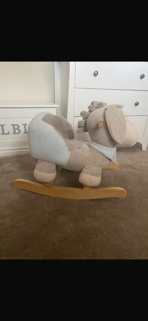 Wooden rocking horse style toy with soft plush fabrics.
