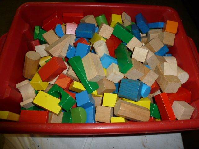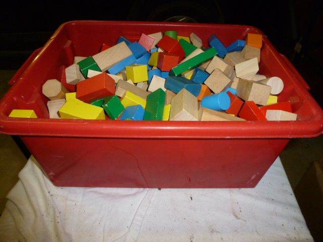 Large Box of Childrens Wooden Bricks in Colours and Natural Wood. Played with but good condition.