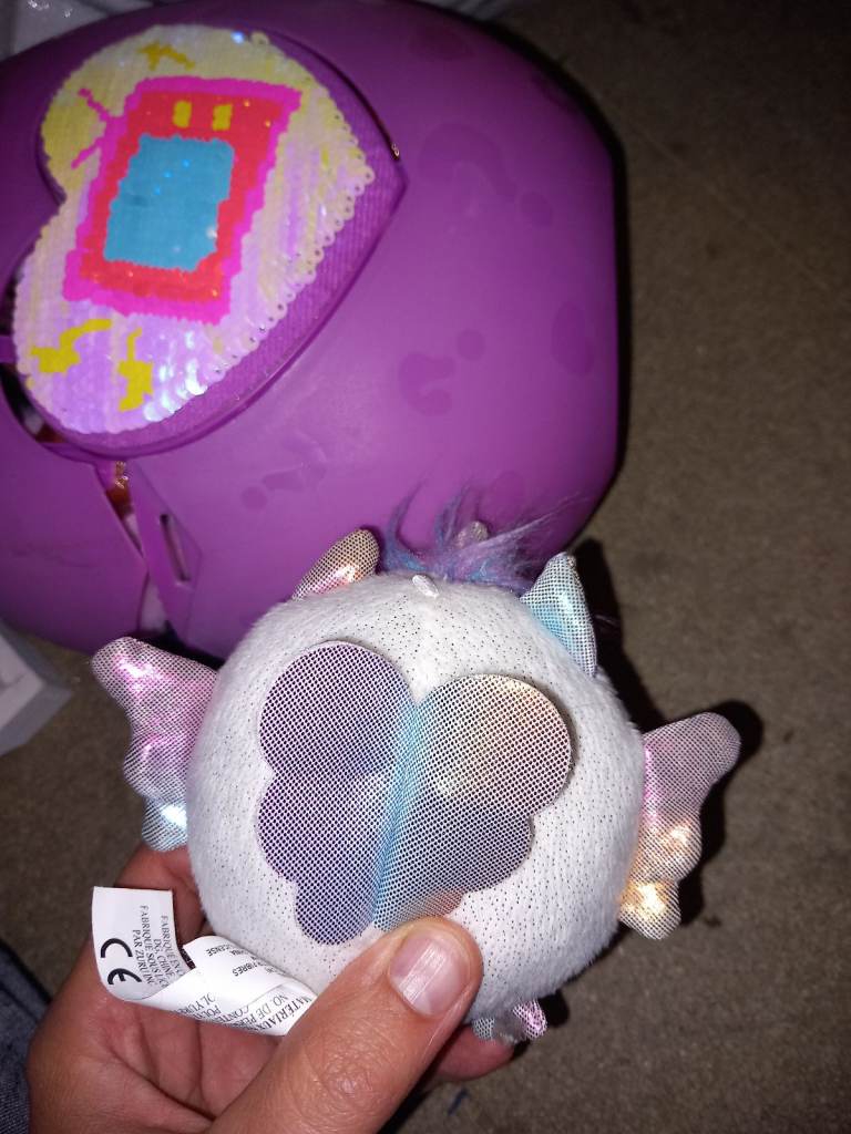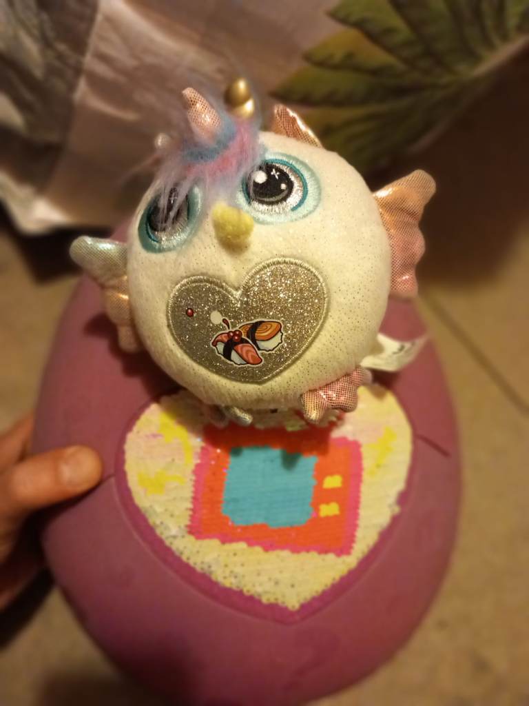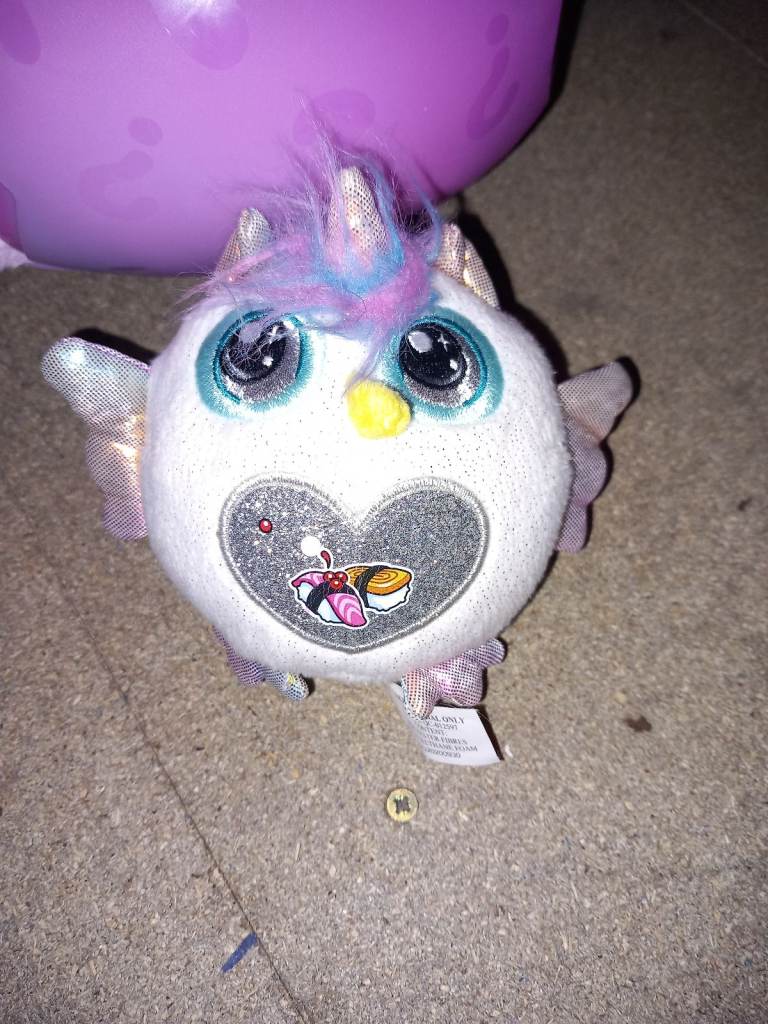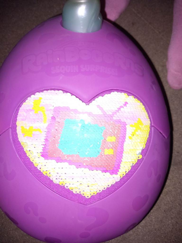 It is a plush toy with a zebra-themed design (black and pink stripes) and features a sequined heart on its belly.
