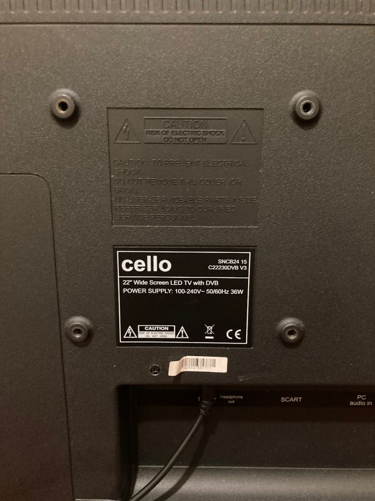 Cello 22” wide screen LED TV with USB. Model C22230. With Remote Control. VGC..