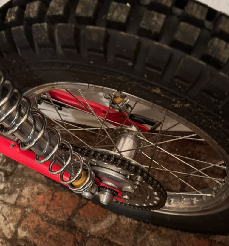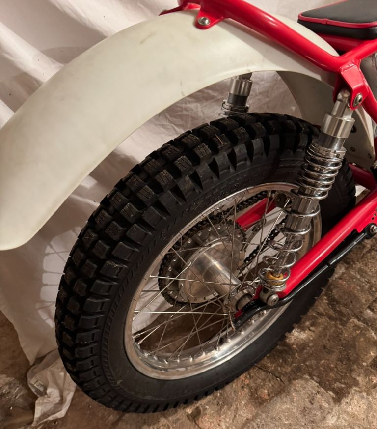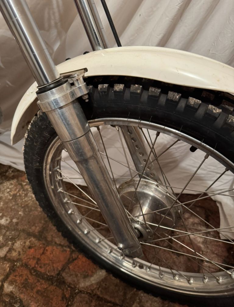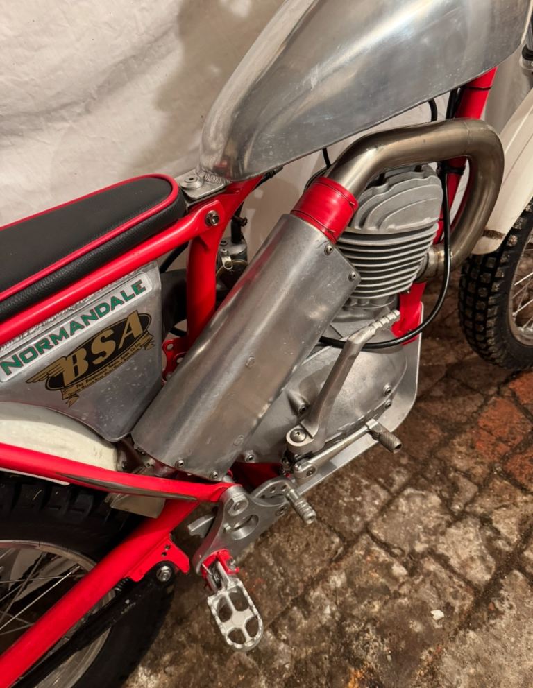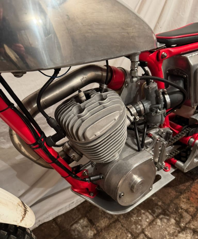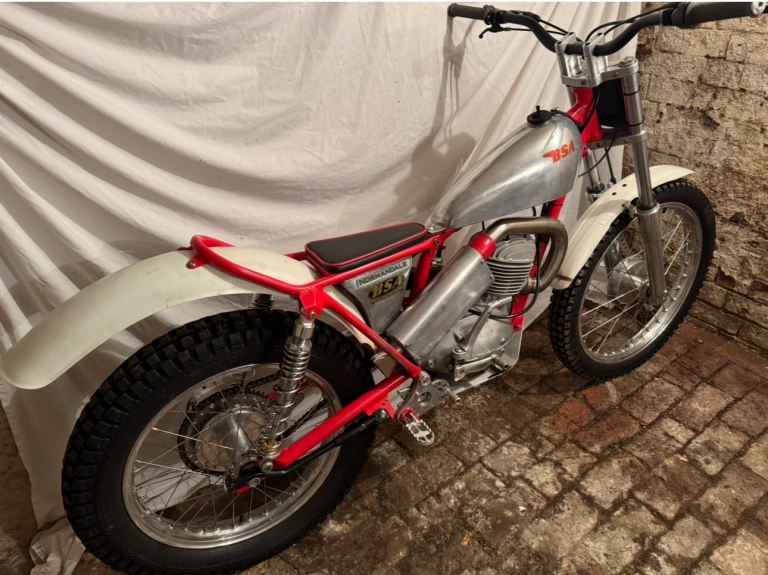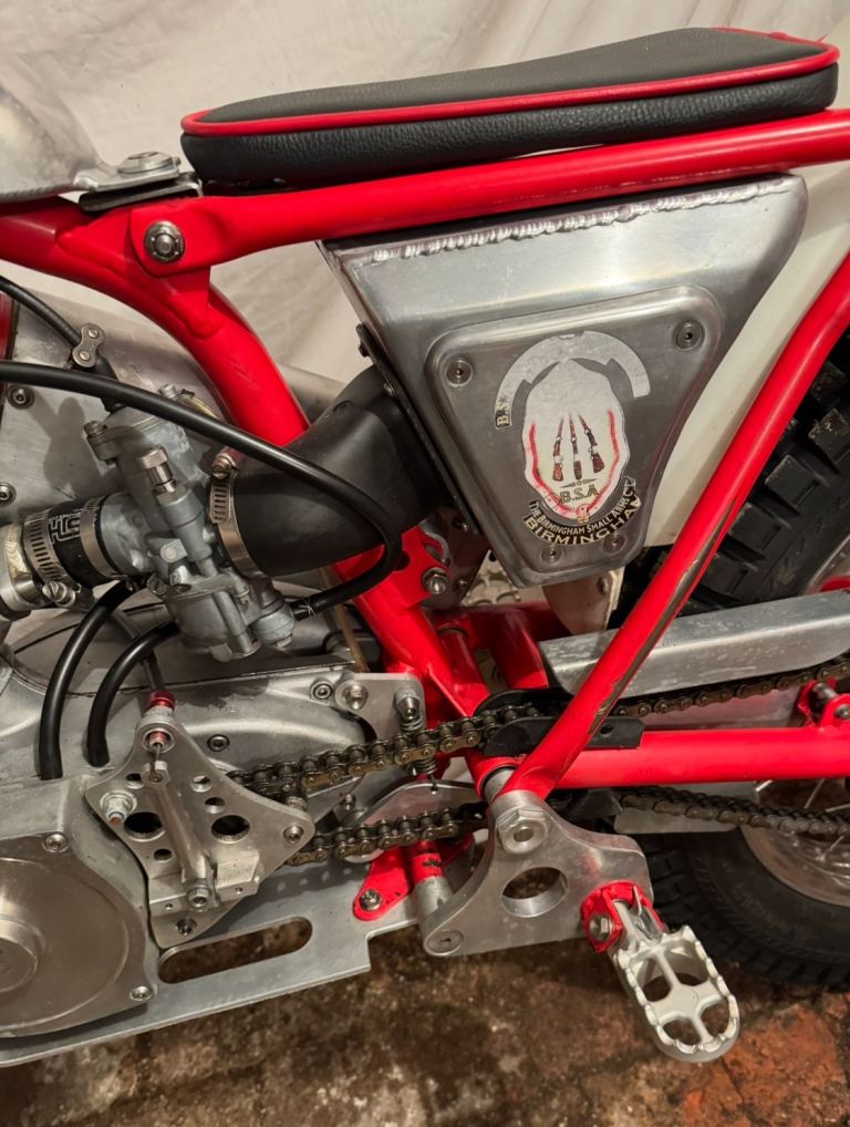 Ex Mick Ash, Rob Homer frame,Alan Whitton hubs, yokes and forks. 200cc spec engine with Neil Walker crank, Todd cylinder head and Mick Dickinson barrel. Yamaha clutch, Suzuki piston and Neil Buckley exhaust. New low 1st, 2nd, 3rd and high top 4th gear. ( no reversed gears ) PVL Ignition Holtsworks tank, Fat Bars and Domino Levers. Very tidy bike and trial winner.