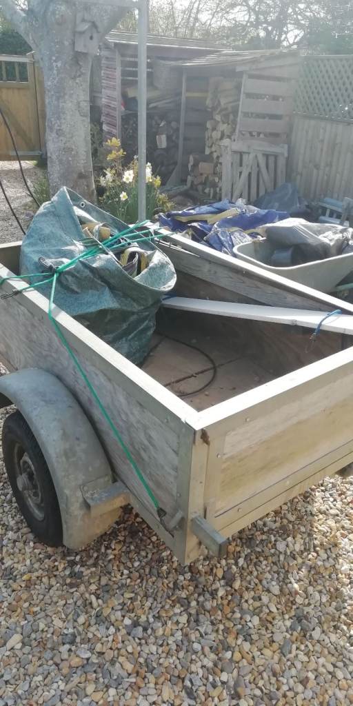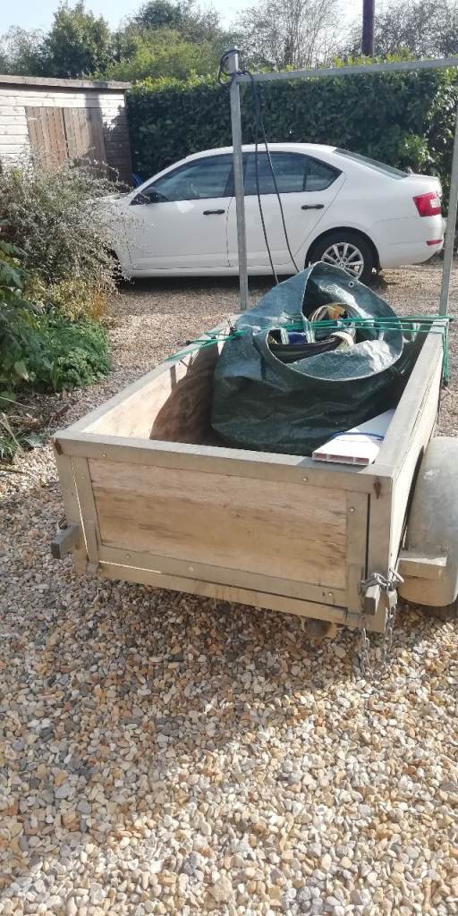 Steel framed car trailer. Wooden side panels and floor can easily be replaced. Capacity one ton