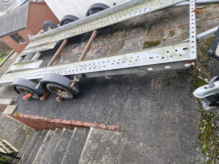 Brian James twin axle car transport trailer for spares / repair . Its the lightweight A series so only 500kg , can be easily moved/ towed. Max load weight 1500kg but has the larger load area of 1.8 x 4.8m so can take larger vehicles. Being sold as repairs as brakes currently disconnected. Tyres decent enough so tows fine as an unbraked trailer.
