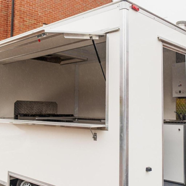 10ft Food Trailer with Lincat 6 ring gas burner, double door oven and multiple gas and electric points. Excellent condition. Hot water, dual sink. Security locks included.