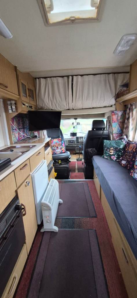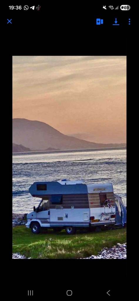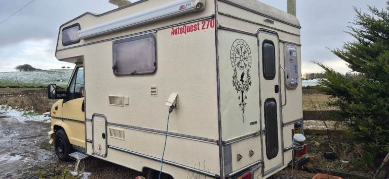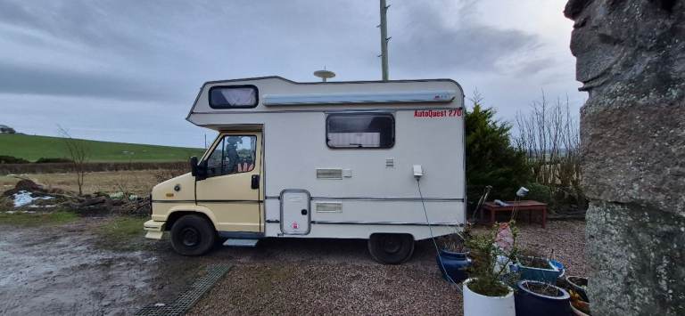 4 birth motorhome EReg 1987 FIAT DUCATO AUTOQUEST 270 coming up for 40 years old next year will be tax exempt( 2027) only 75500 mile on clock 2lt petrol solid underneath no damp roof /vents been sealed with cromapol silkaflex. I painted the body last year. Inner wings been welded and battery area all electric ignition and coils were also changed and new front calipers break pipes new tyres new wiper mechanism and blades lots of past history paperwork last month. Spare wheel covered under bonnet area . Brand new exhaust last year too , new rear light covers. Vision plus tv receiver ariel on roof . Fold out double bed in seated area & double bed above cab area with extra foam for both beds All lights inside been replaced with led lights on ceiling mood lighting around window. Has square 240 v led light inside. Outside back door light changed to led. Front seats changed out to leather BMW seats separate toilet/shower room . Comes with water butt & gray waste royal butt 2 full gas bottles and full equipment with everything you need for hitting the road. Has reversing camera and dash cam. & has immobiliser. Will come with one years mot .also has Fammia canopy, Fammia privacy room awning she runs a dream not fast but gets there we've been all over Scotland in her . we've had lots of memories laughs over the last 7 years since we've owned her will be sad😪 to see her go but we're upgrading to fixed bed. viewings welcome 🚍
