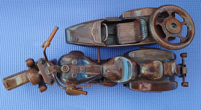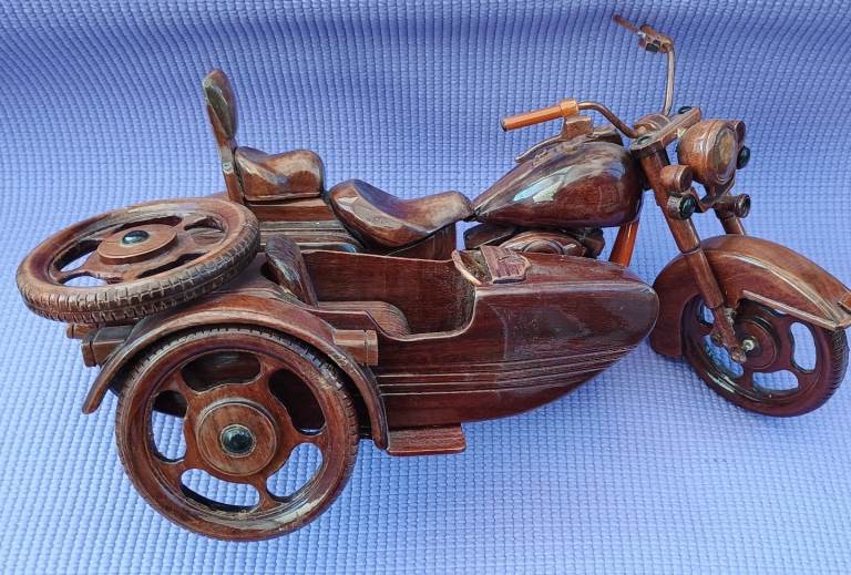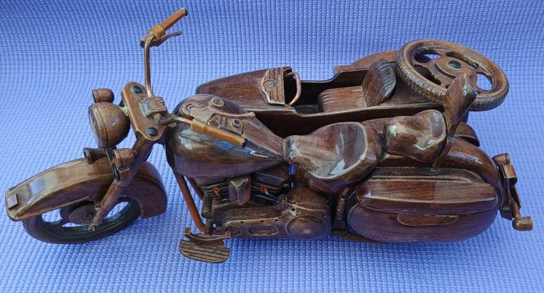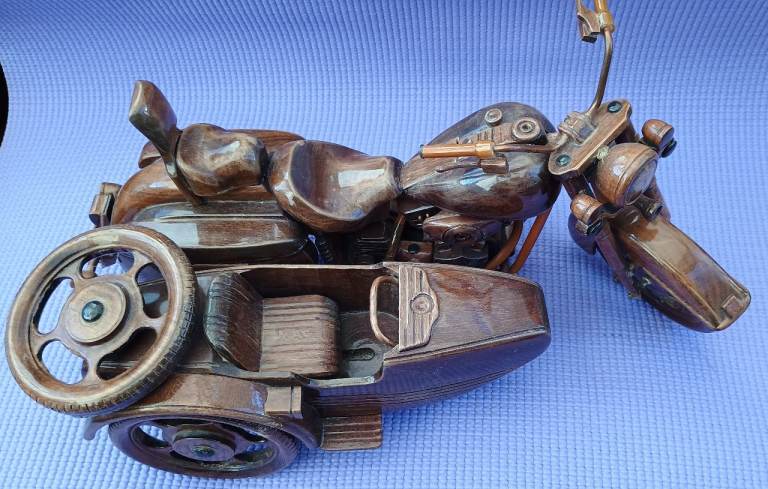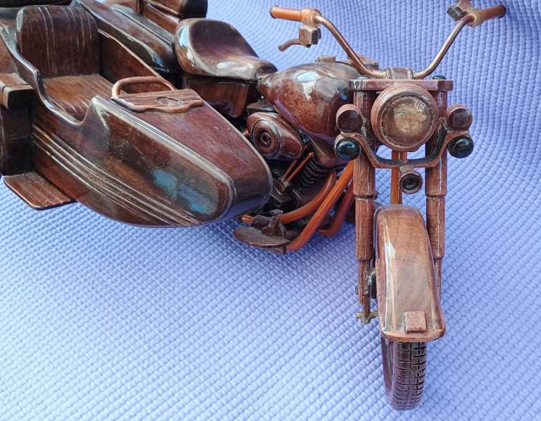 Hand crafted wooden model motorbike and sidecar, in good condition and makes a great display for you motorbike enthusiast's