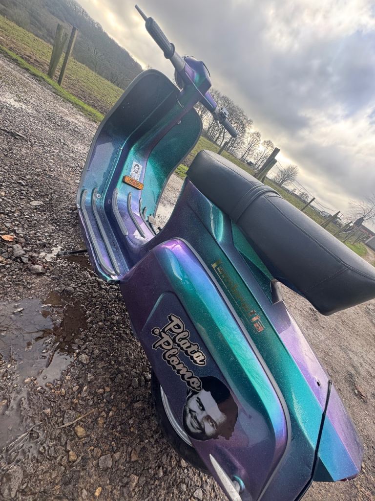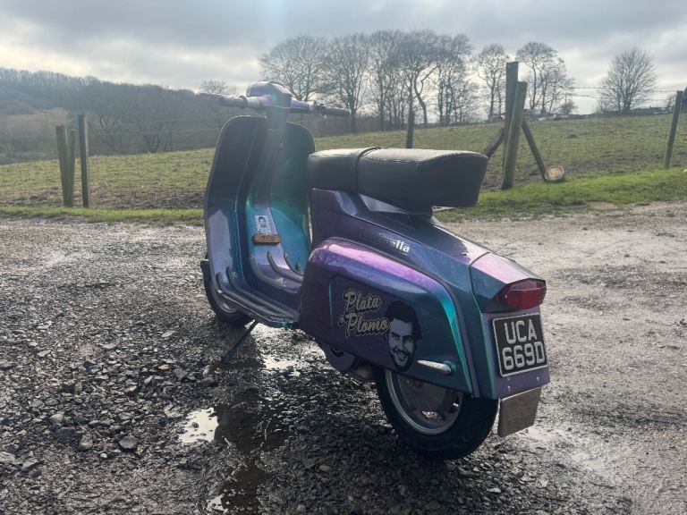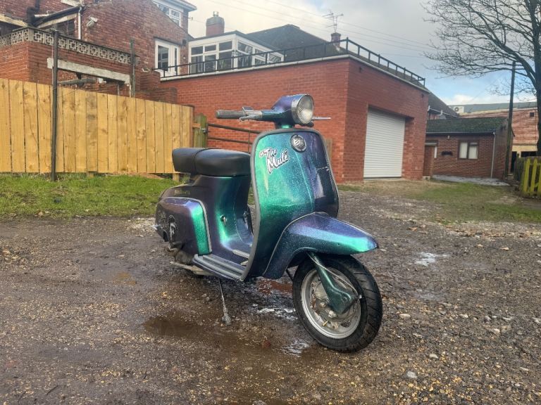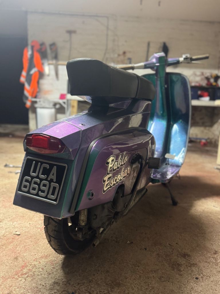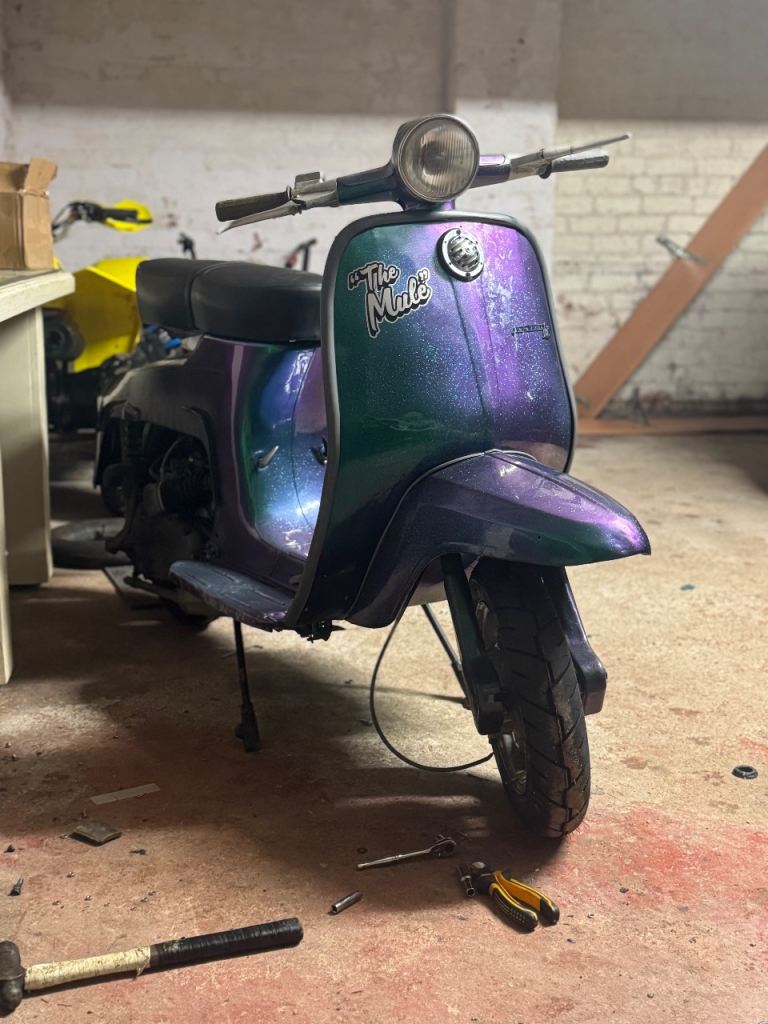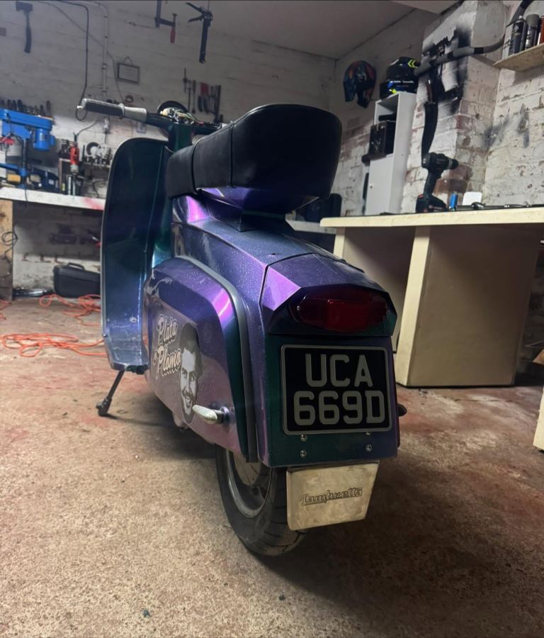 Chameleon paint job with blue holographic flake, new Michelin S1 Tyres front and rear with new Michelin inner tubes, new grips, leg shield grey trim, foot plate runners, new bulbs, new headstock bearings, new engine cones, new engine centre bar and spindle nuts, new rear plate, speedometer blanking plate, new handlebar switch and loom, new fuel tank lid and gasket and other bits and pieces..