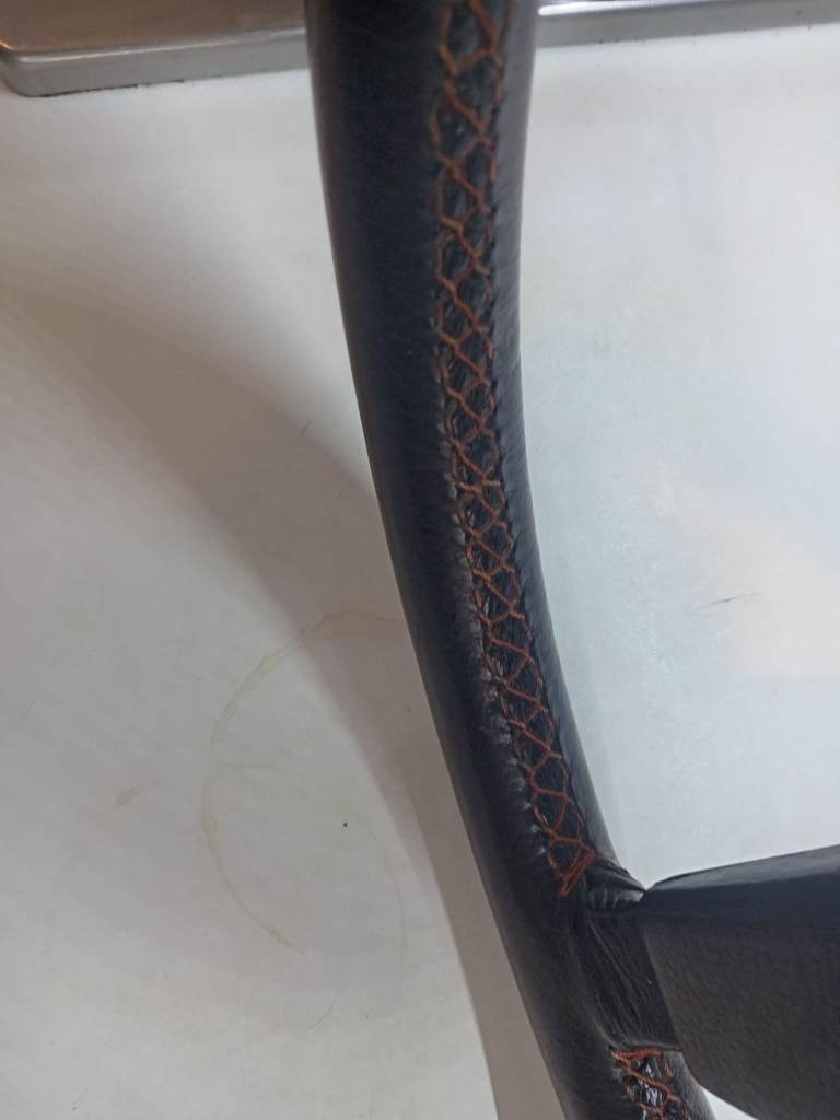 Black leather covering with red polyester stitching, hand made by the original steering wheel manufacturers, Clifford coverings Ltd of Spring road, Birmingham.