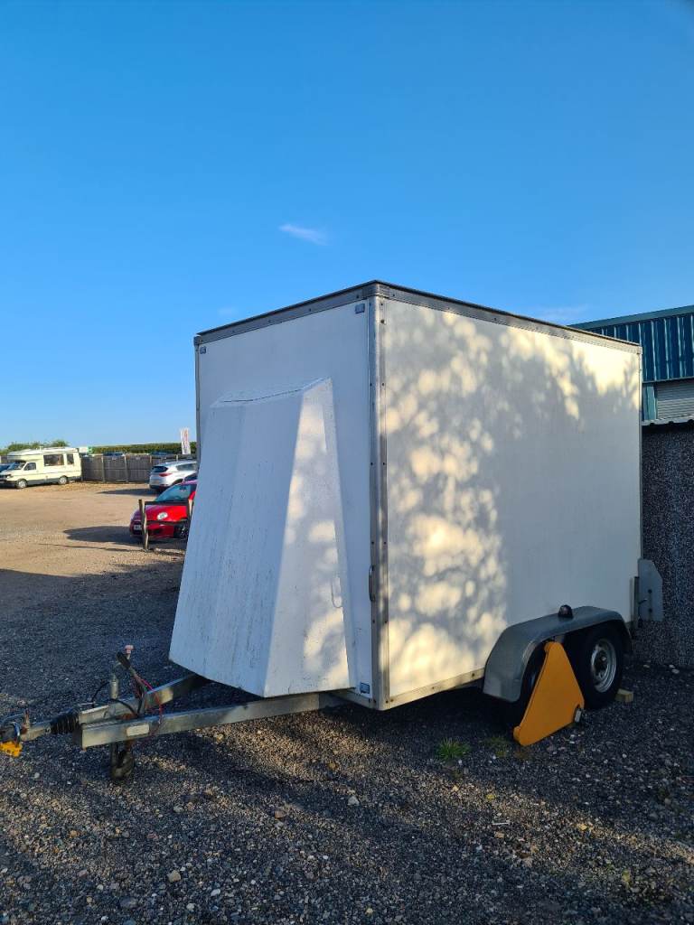 Box trailer. Galvernised chassis. Box size length 3 mtrs, width 1.8 mtrs, height 2 mtrs. Rear loading ramp is 1 mtr wide by 2 mtrs long. Total length 4.7 mtrs. All sizes are approximate. Great tyres all brakes and lights work.