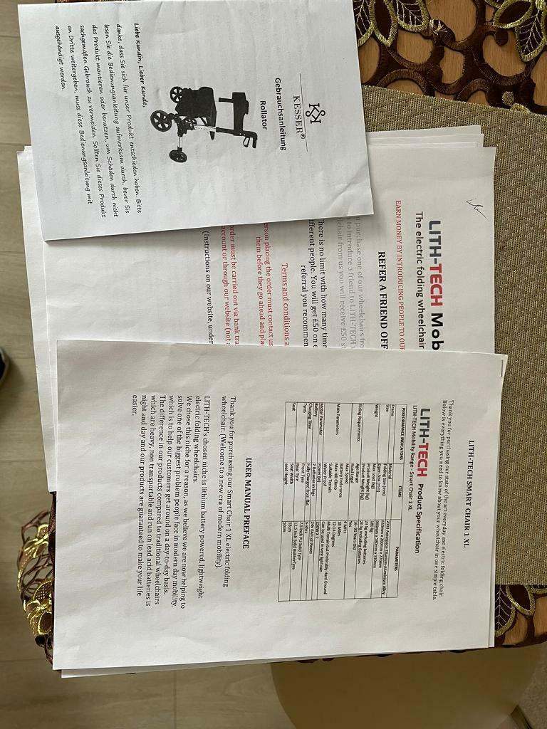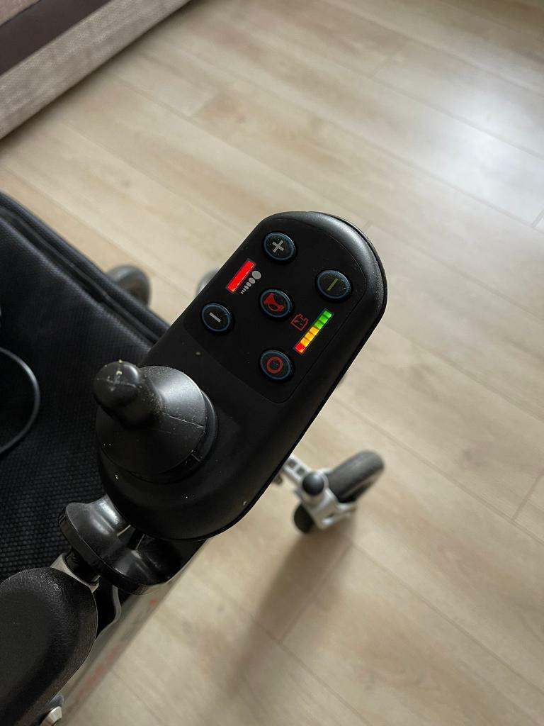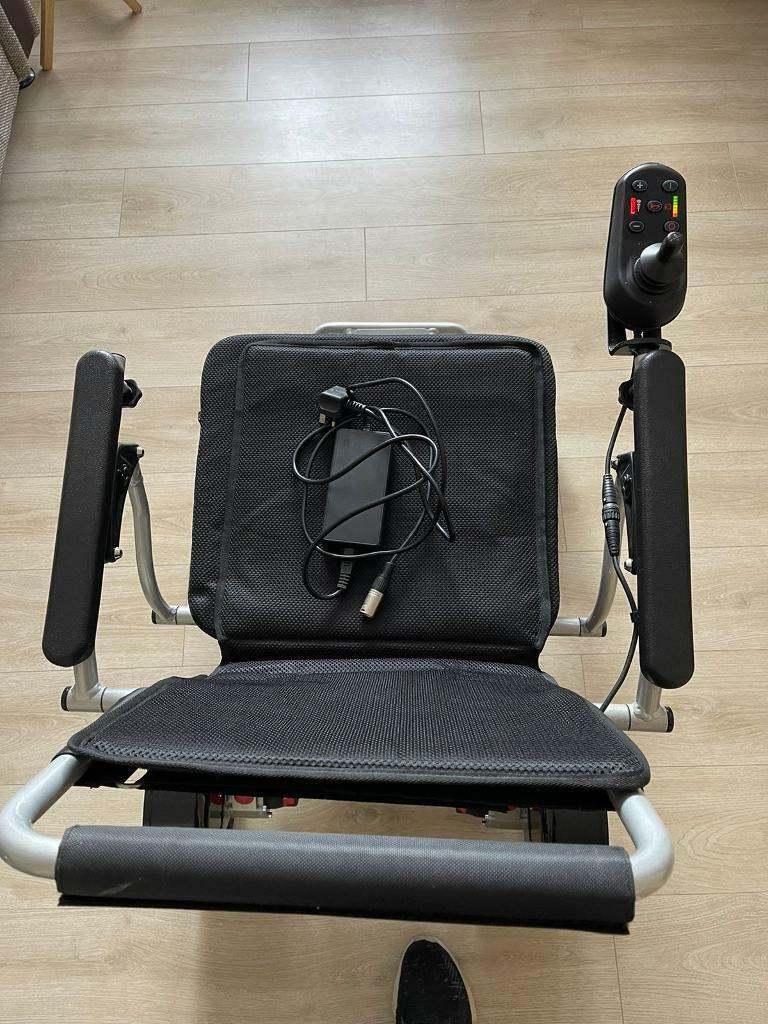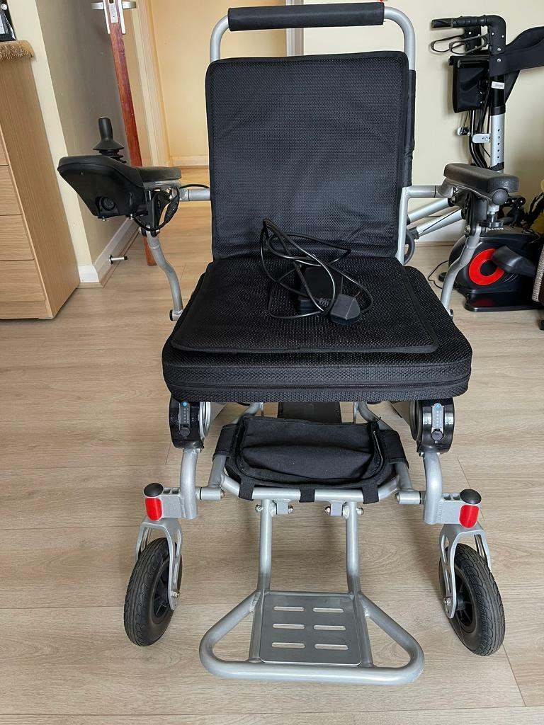 It is in near perfect condition except for a few little scratches on the underside of the footplate. It has a very comfortable chair and was initially bought because at the time it was the world’s lightest electric wheelchair. It takes 2 seconds to open up and close up and will fit in the smallest of cars and is approved for air travel. It comes with charger and manual.