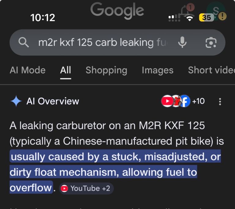 carb is leaking petrol but just needs taking off and cleaning or adjusting easy and quick fix other then that bikes mint