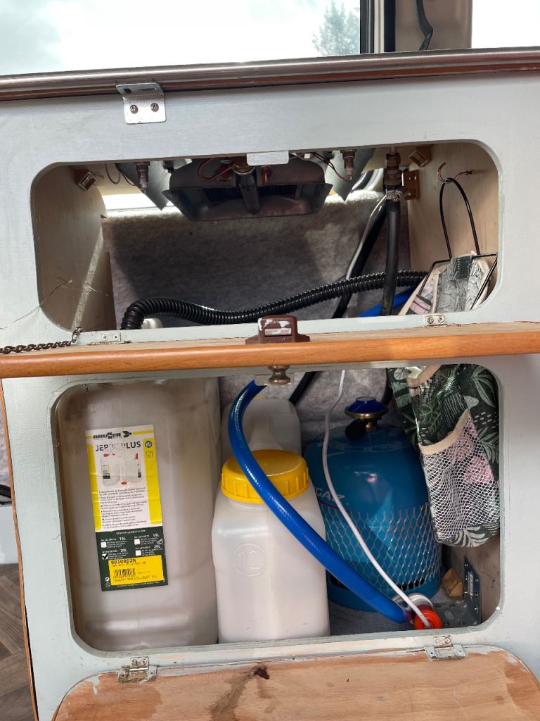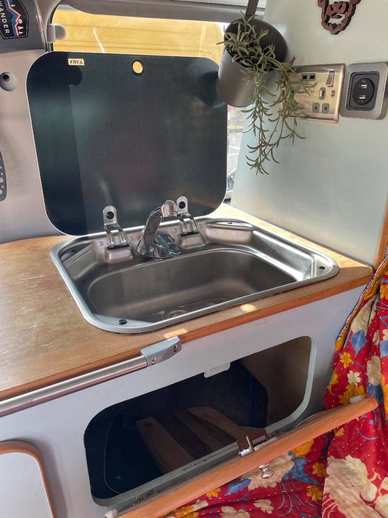 - Kitchen: sink, 12L fresh water tank, 20L grey water, 2 rings gas burner and gas bottle.