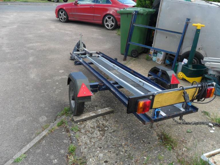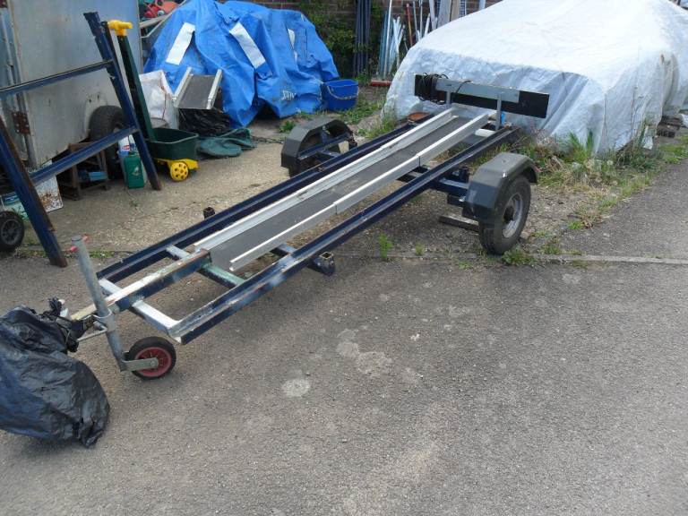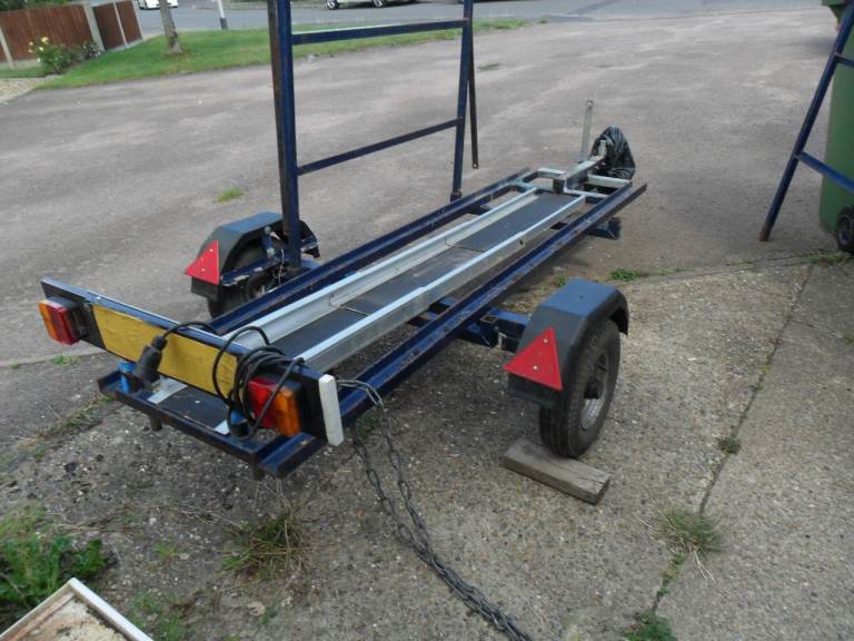 multi purpose trailer made by indespension of Norwich for carrying tandams with removable side racks with aluminum wheel rail for motor bikes ,push bikes canoes etc ideal for sports extra`s on holiday