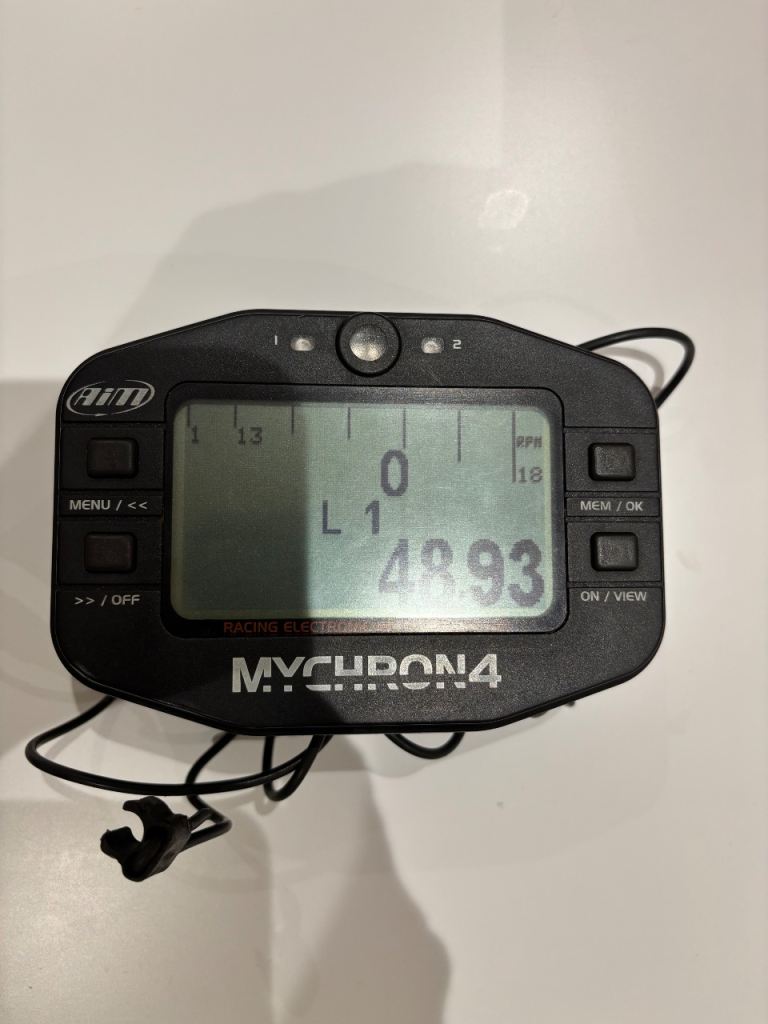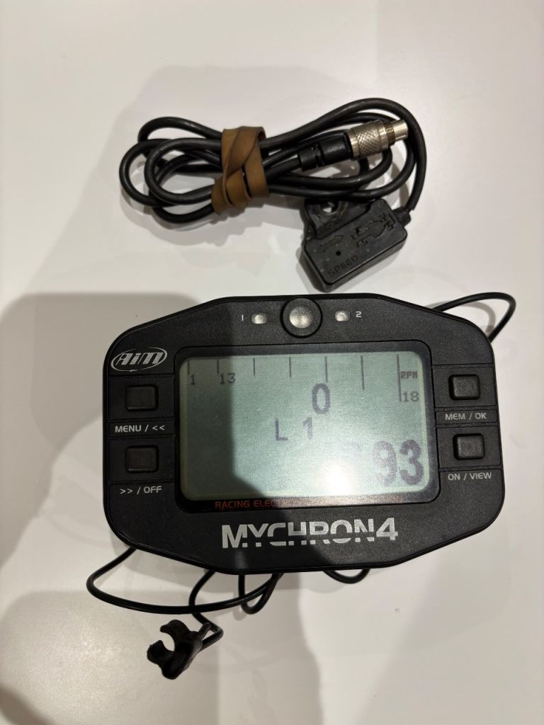 Used MyChron 4 lap timer and engine telemetry. Still works perfectly. The magnetic pick-up that attaches to the floor has a crack in the casing that has been repaired. Works fine though.