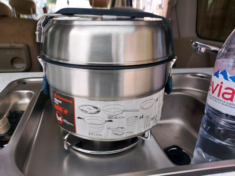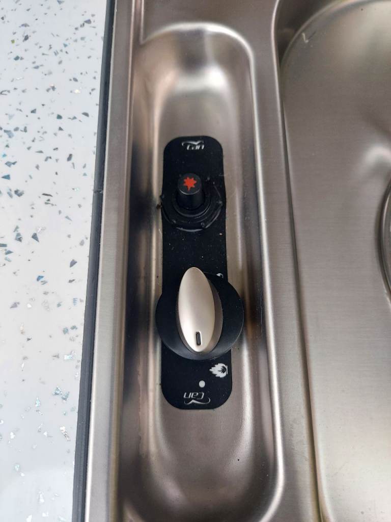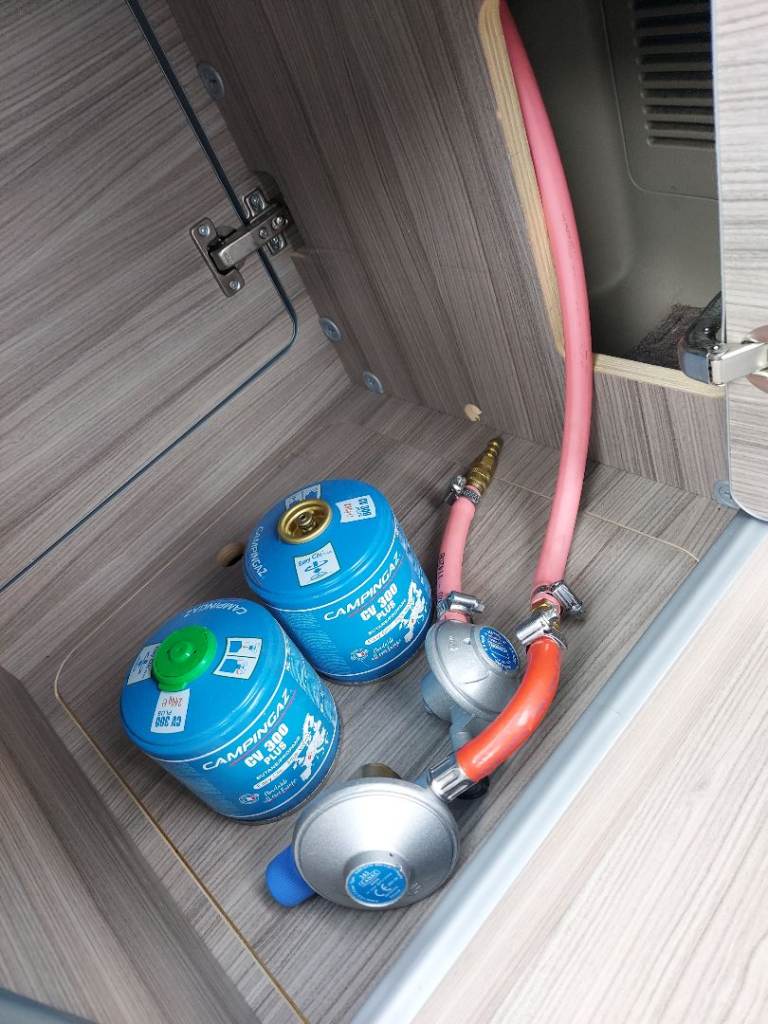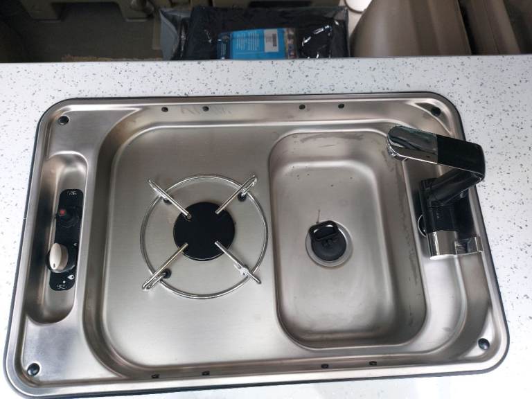 New Kitchen fitted with gas cooker, sink, water tap, fitted cupboards for storage and internal rear LED light fitted for night use and cooking!