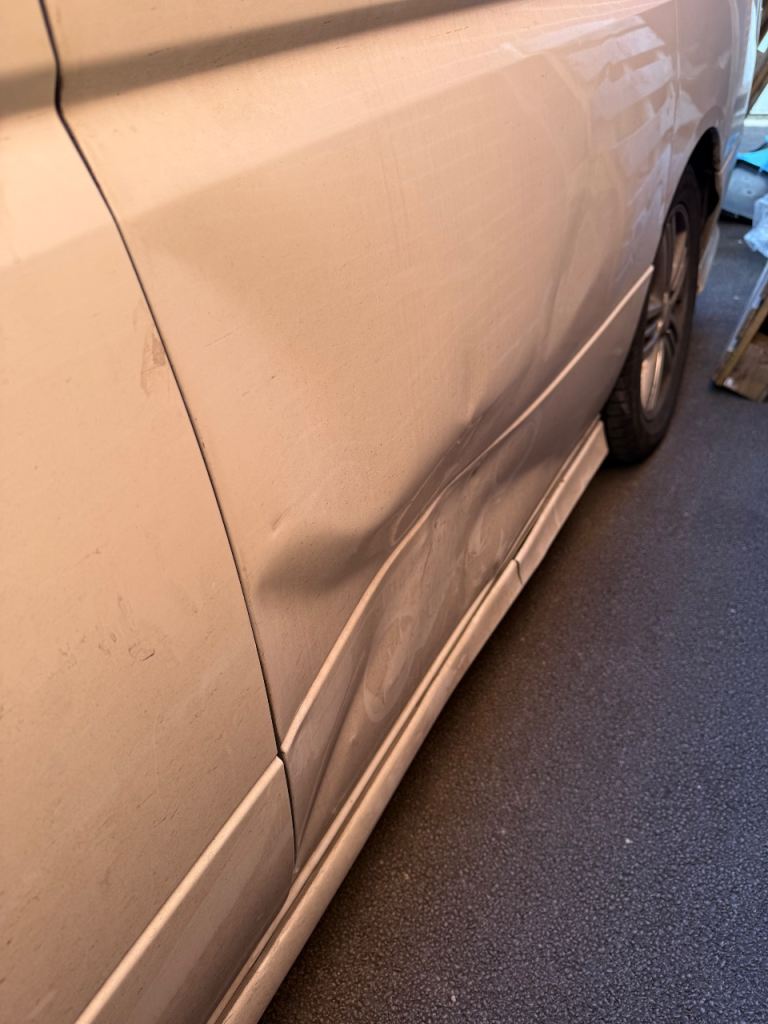 Rear passenger sliding door has a large dent