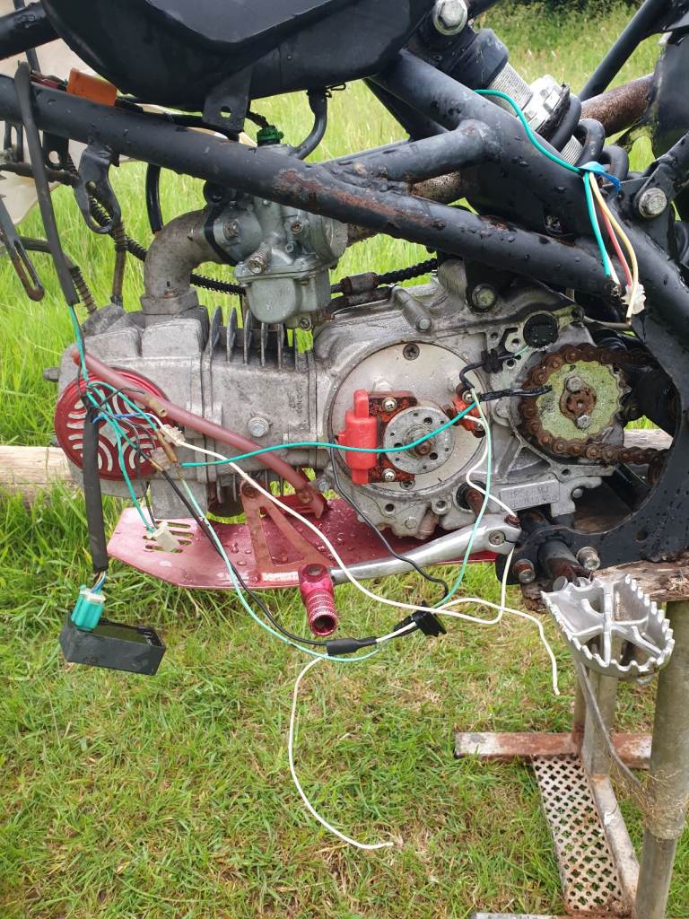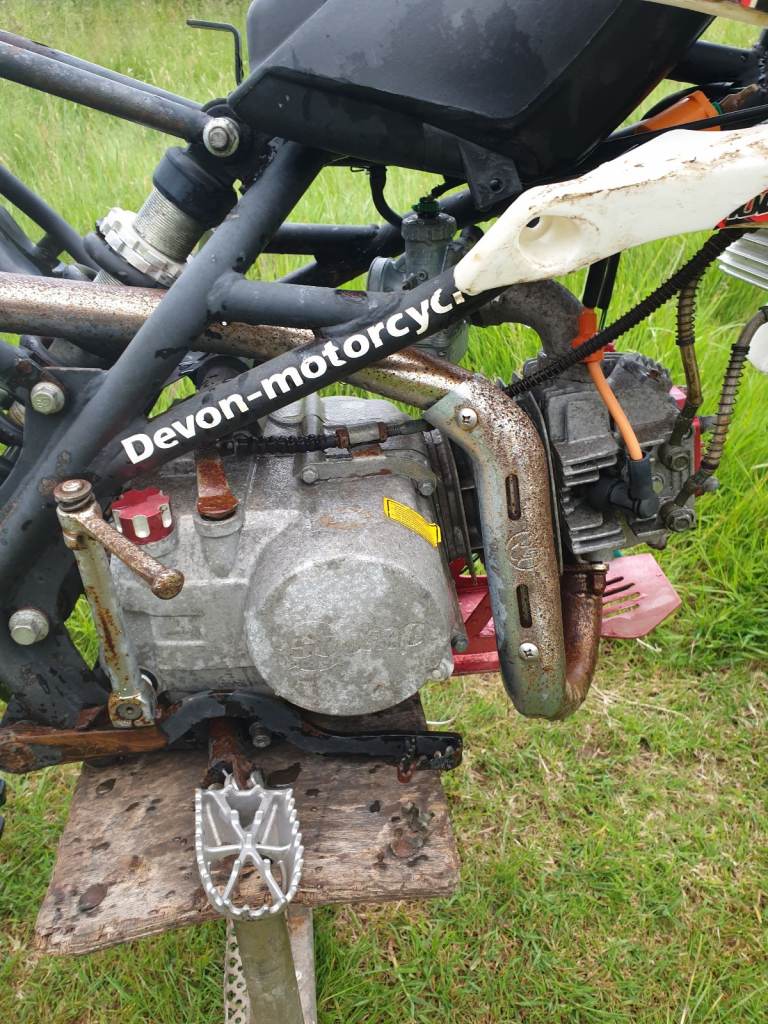 2 pitbikes spares or repair the orange 1 has no engine the other was running until the chain came of and broke the magneto commen for pitbikes. Been sat in the shed for couple years box full of bits to come with as well