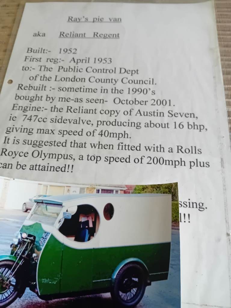 3 wheel Reliant Regent 747 cc engine 4 gears constructed 1952 rebuilt mid 1990s owed by present owner since 2001 had undertaken many trips both in U K and France drives well full service history available. Would make ideal advertising sign .