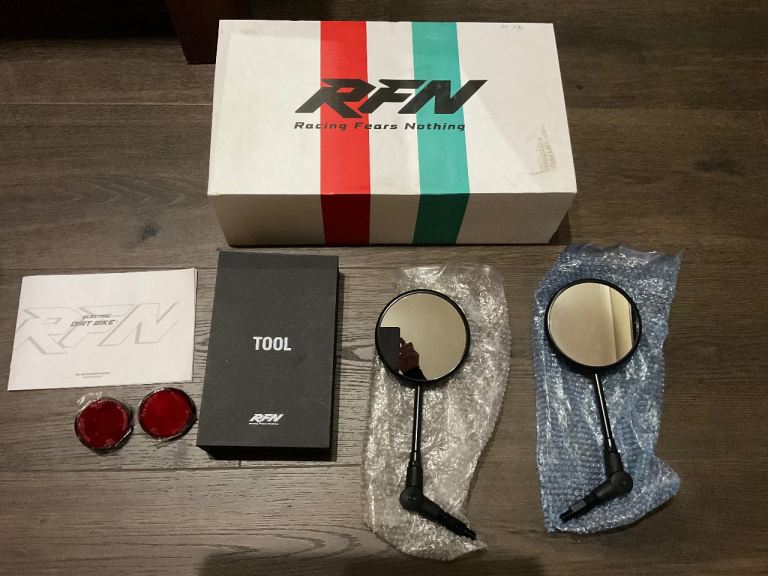 Comes with original box containing manual,mirrors,reflectors,tool kit & charger.