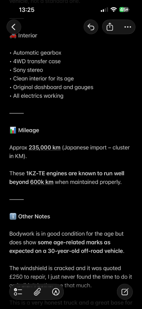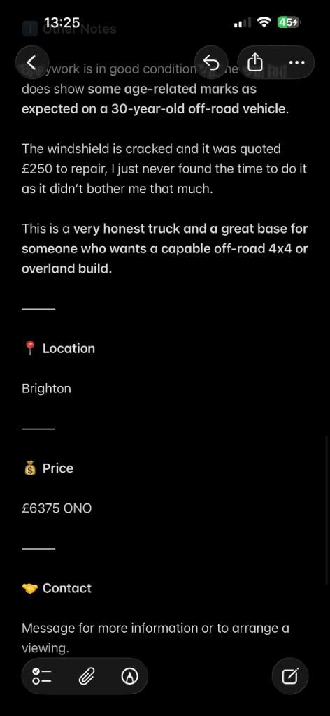 The only thing to mention is a cracked windscreen, which I was quoted around £250 to replace, but I simply haven’t had time to get it done.