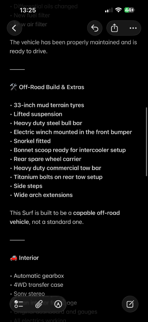 I bought the vehicle last year and since then it has had three full services and several mechanical upgrades to keep it running strong and reliable.