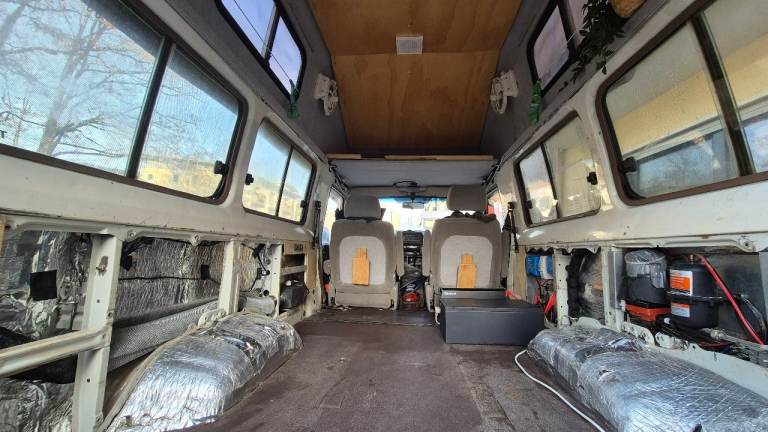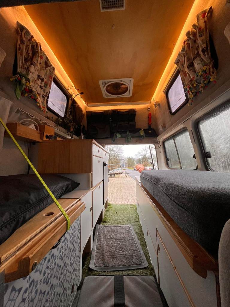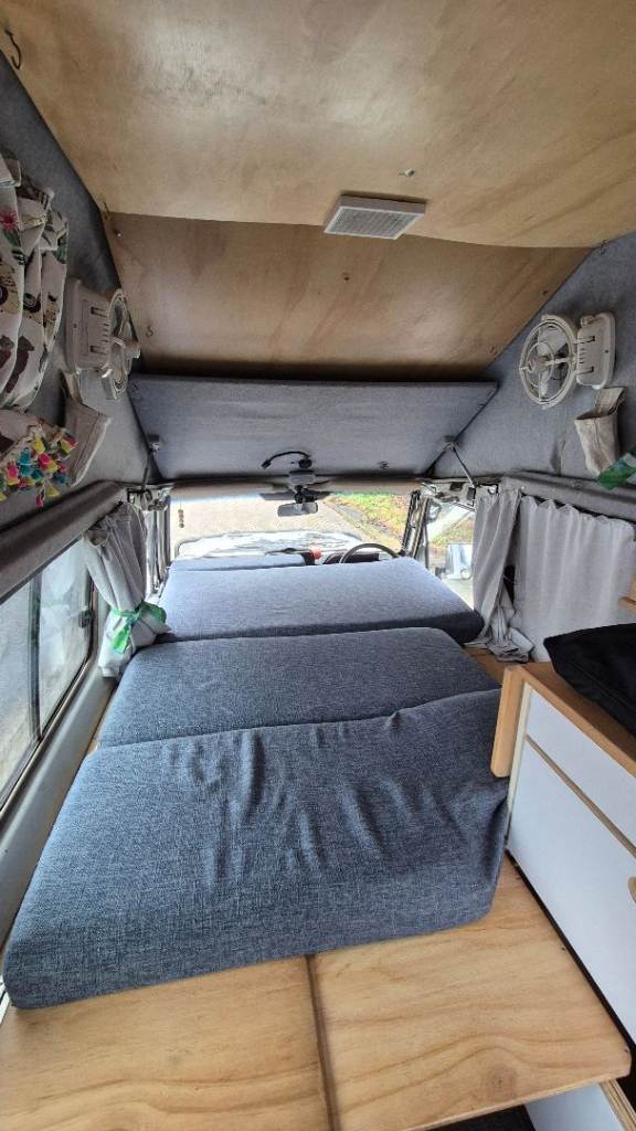 The bed is "downstairs" as shown, but can easily be converted back on to with some 19mm plywood as it was originally intended.