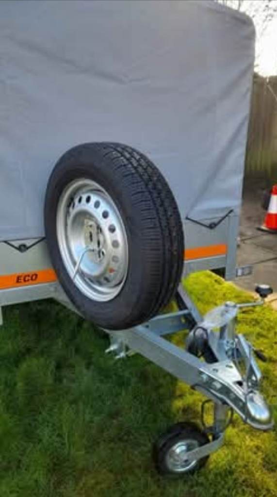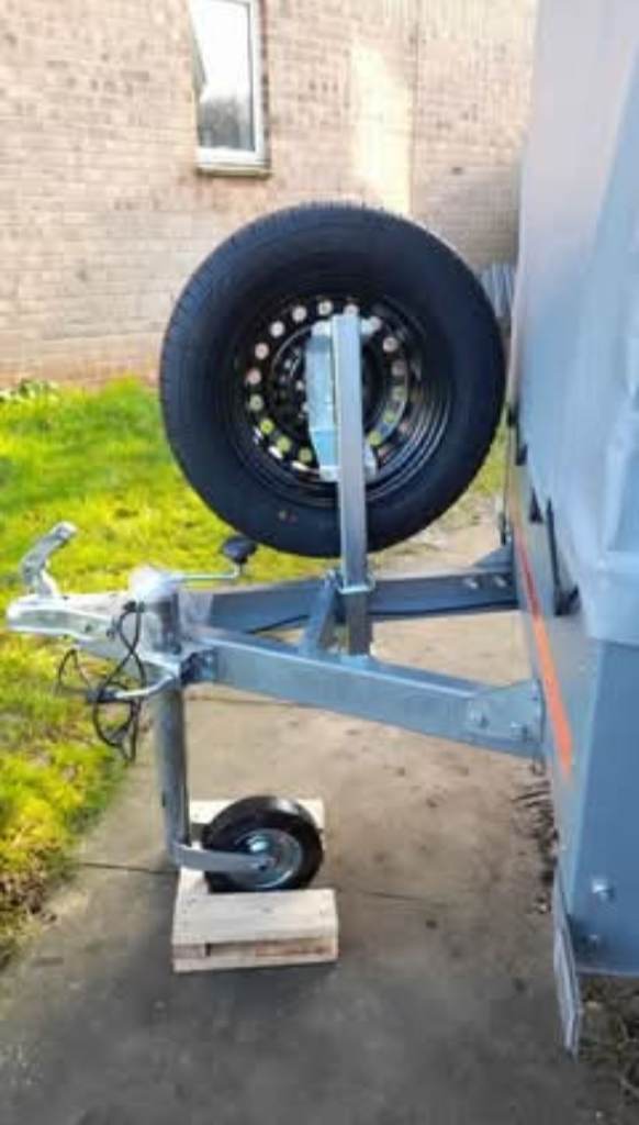 Single axle trailer with spare wheel and cover.