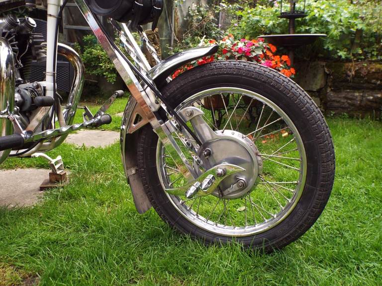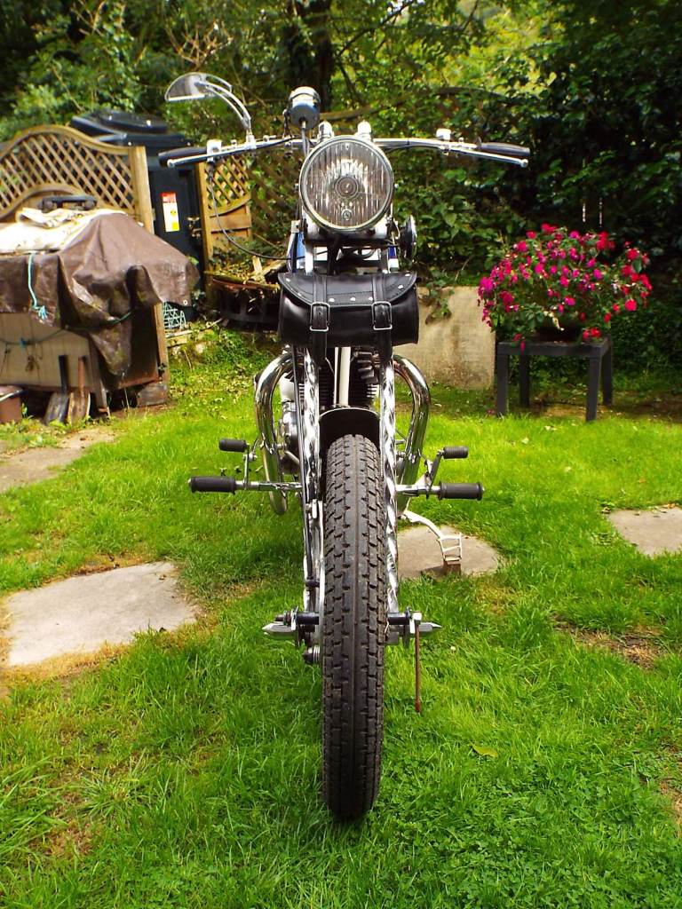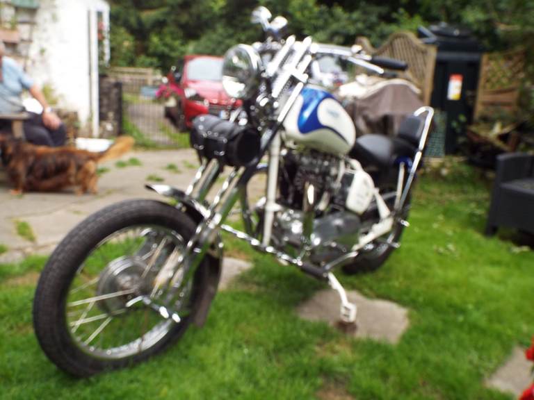Triumph Sprung Hub Chopper, definitely a ONE OFF. Has been totaly refurbished, including, Magneto, Dynamo, Crankshaft, Valves and Guides and Wheel Bearings. The Forks have been made from SOLID Square Bar and formed into a helical twist. Has been owned by Dai for 7 years and V5 is in his name, see end photo for his phone number, do NOT CONTACT ME, phone David.