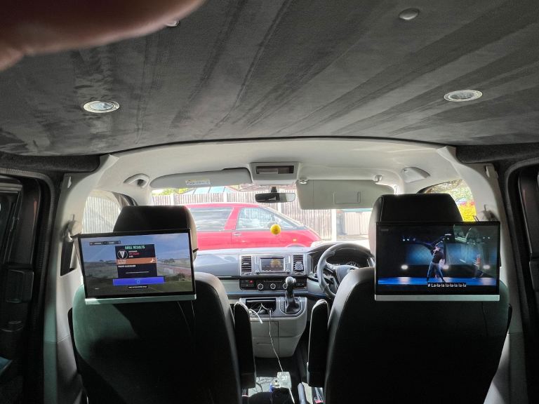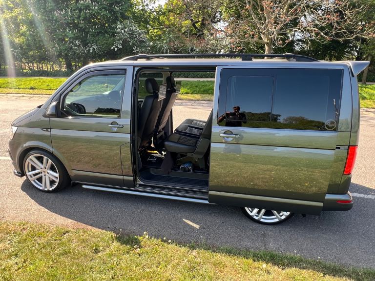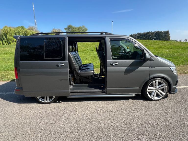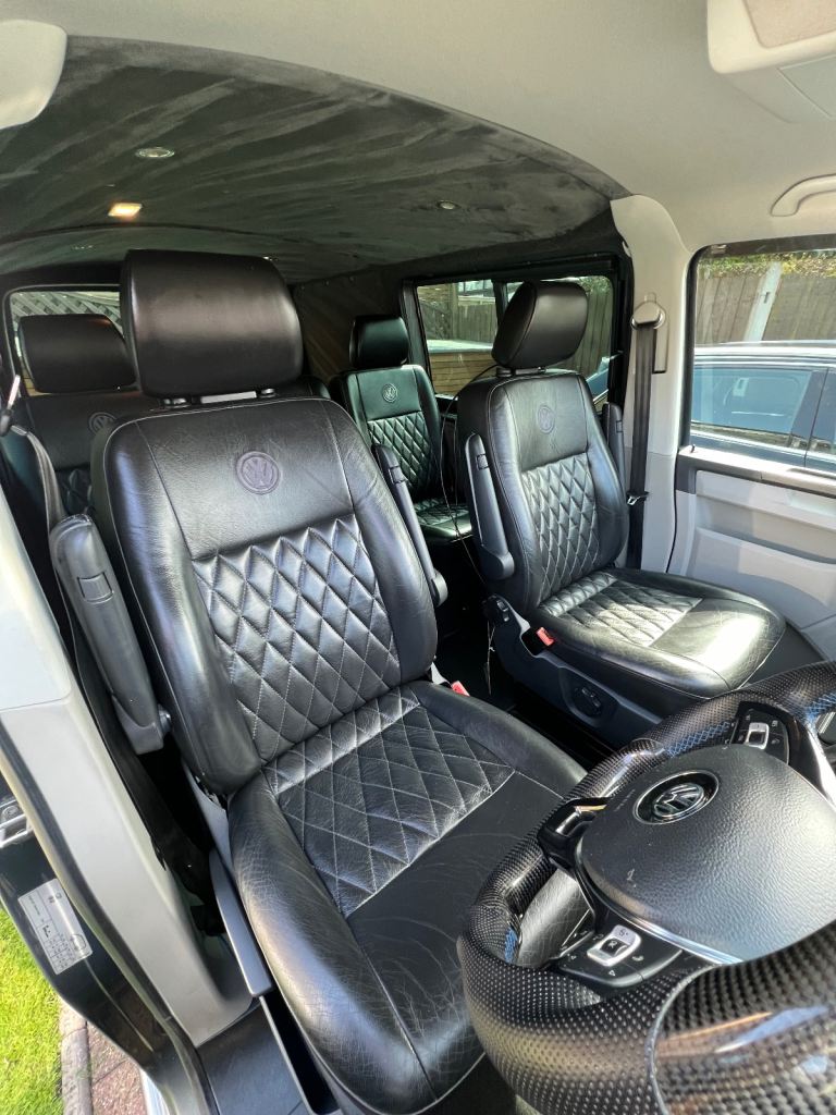 Vw transporter 2018 204ps kombi van Automatic (cat s) professionally repaired now . & can provide pictures of before the repair. indium grey with black Bentley stitch embroidered leatherette seats all been sound deadend and carpeted throughout with faux suede affect ceiling & rear door cards , 20” twin 5 Navis wheels that look awesome. Colour coded side bars ,Roof bars , rear parking sensors with reversing camera, xenon headlights with led daytime running lights , full Vw service history, moted till August, two keys , wallet and manuals, auto lights, auto wipers , cruise control, Electric heated folding wing mirrors, heated windscreen, electric twin sliding doors, tinted windows, ps4 , twin 13.3” screens. Air ride suspension Awesome van that’s been taken care of whatever the cost.