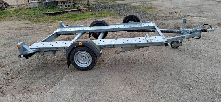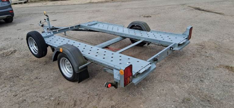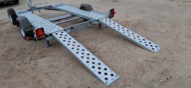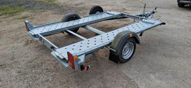 For sale lightweight single-axle transporter. Specifically designed for towing Smart cars, micro cars or small track cars. The trailer is in very good condition, being made of all galvanised steel, therefore no rust. It has two rear prop stands, spare wheel and carrier, heavy duty jockey wheel, 13 pin electrics with 7 pin adapter and two slide ramps. The bed of the trailer is 2.64m long x 1.70m wide.