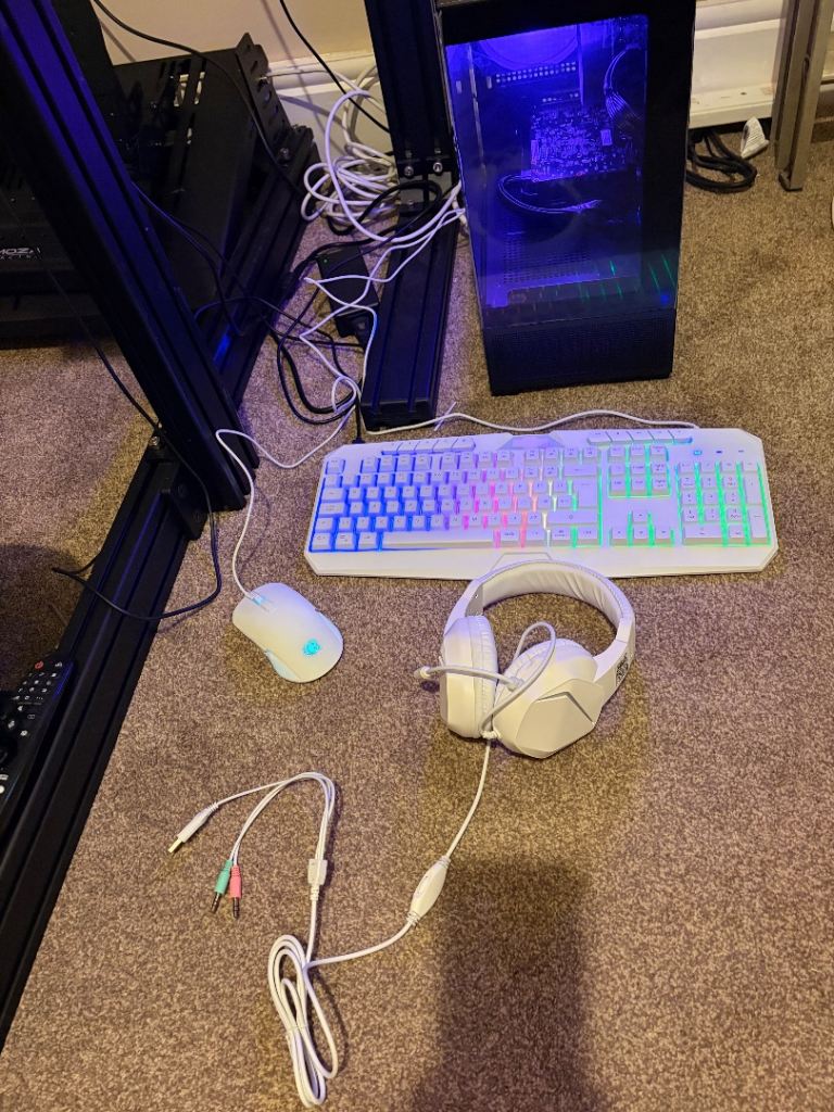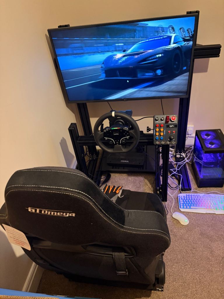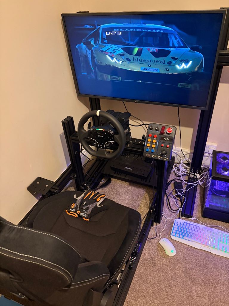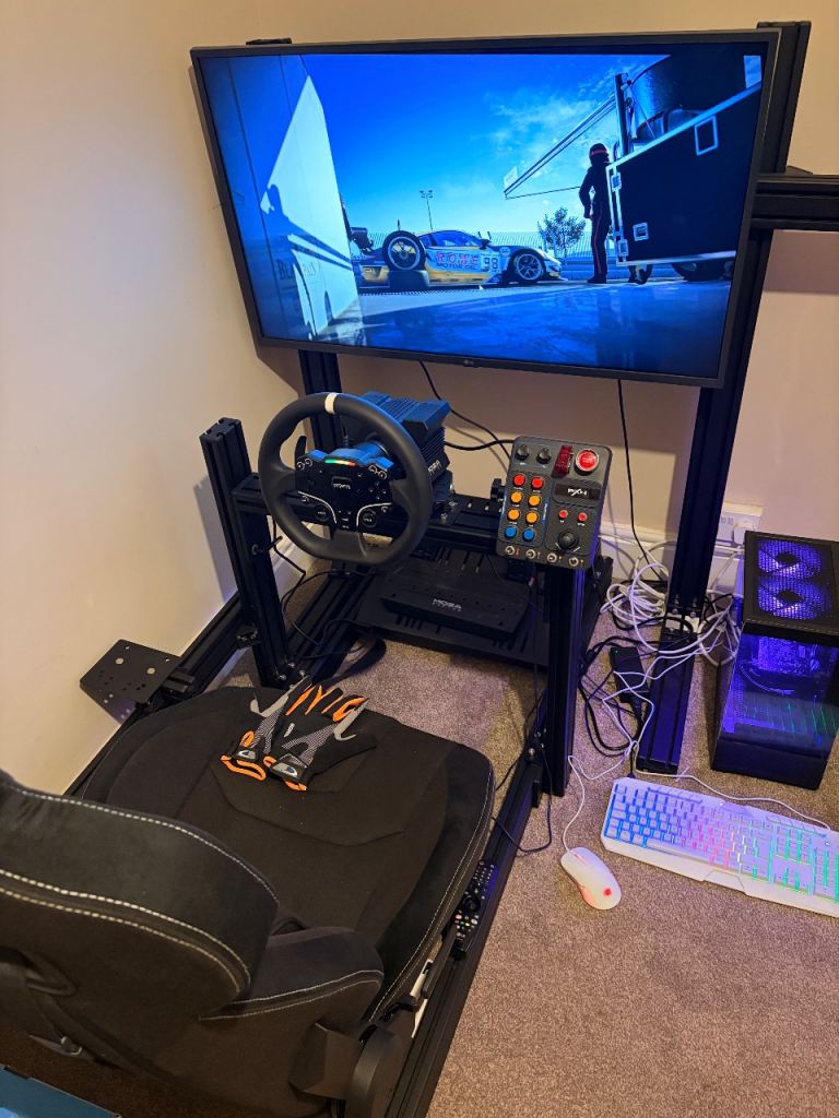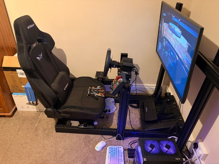 Full racing set up GT Omega seat wth lumbar support and frame, Monza Wheel and base, Monza throttle and brake, PXN CBN Button box. 42” Smart TV, Hi Spec PC with keyboard, mouse and head phones with mic. Games loaded are Forza 5 , Asetto Corsa Rally and Asetto Corsa Competizione I bought this set up brand new the PC was brand new still boxed only downloaded the 3games . Still have boxes for most of it. Don’t have the time to use it and it’s a shame it’s not getting used purchased the beginning of December just gone. The spec for PC in pics. Can be seen set up and tested. £1300