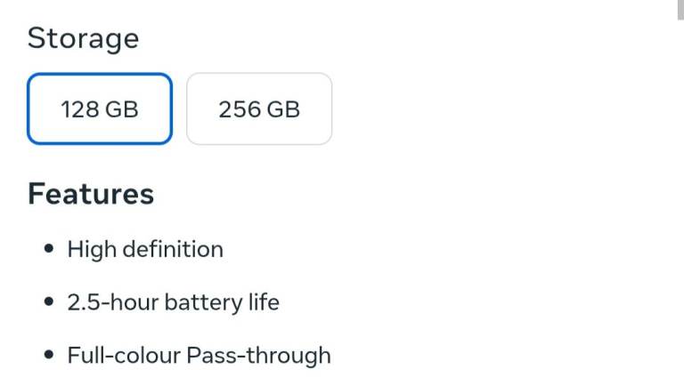 128 GB option. Storage options to match your needs. Higher storage allows you to download more experiences to your headset, or video content for offline viewing.