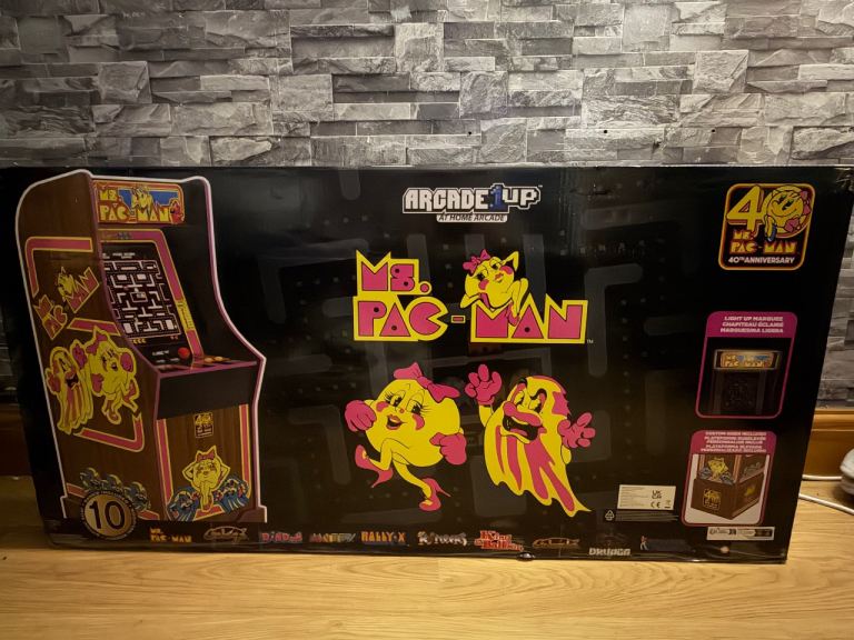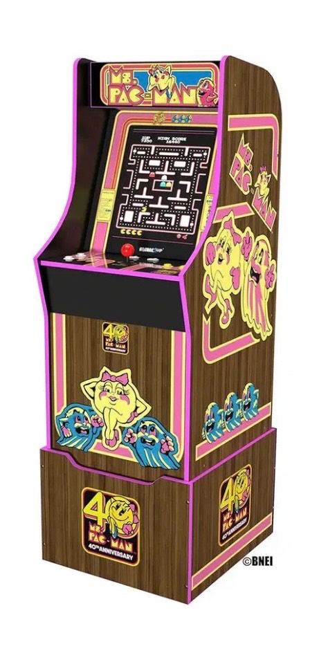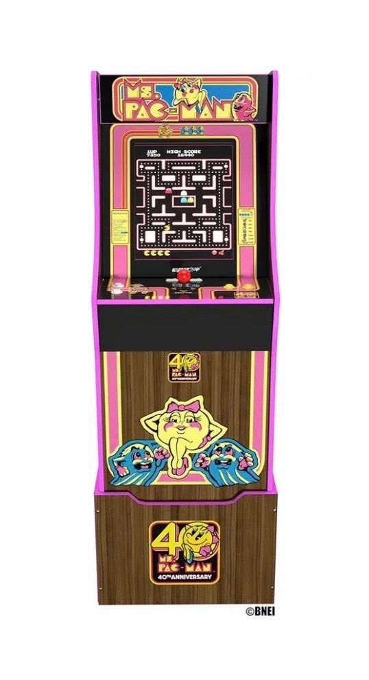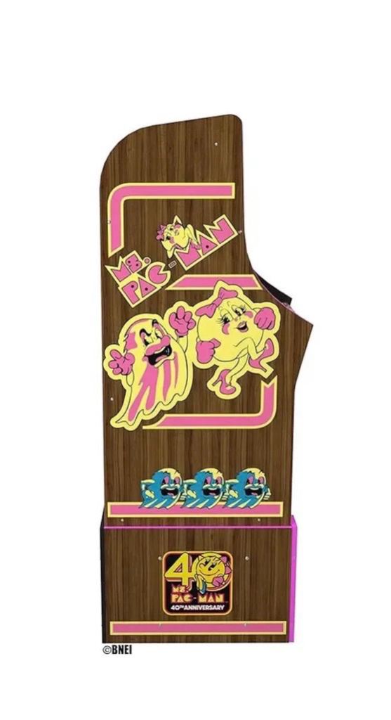 Celebrate four decades of arcade classics with the Arcade1Up Ms. Pac‑Man 40th Anniversary Arcade Machine. This limited-edition unit packs ten legendary Bandai Namco titles, including the star, Ms. Pac-Man, into a stylish cabinet complete with a riser emblazoned with the 40th Anniversary logo. From iconic ghosts to maze-chomping action, this machine delivers retro thrills and nostalgia in one stunning package. Perfect for collectors and fans of pixel-perfect gameplay, this arcade machine combines authentic controls, crisp visuals, and attention to detail, making it the ideal centrepiece for any game room or entertainment space. Key Features: Crystal-Clear 17″ LCD Display: Enhances gameplay with sharp, vibrant visuals. Illuminated Marquee: Fully functional light-up marquee for that authentic arcade ambience. Genuine Arcade Controls: Responsive buttons and joystick replicate the classic feel. Adjustable Volume Control: Set the sound level to suit your surroundings. Anniversary Collector’s Design: Special limited-edition styling with a riser featuring the 40th Anniversary logo. Added Safety Feature: Includes an anti-tip strap to keep the cabinet secure during play. Ten Games in One Cabinet: Ms. PAC‑MAN GALAGA GALAXIAN DIG DUG MAPPY RALLY‑X ROLLING THUNDER ROMPERS THE TOWER OF DRUAGA KING AND BALLOON
