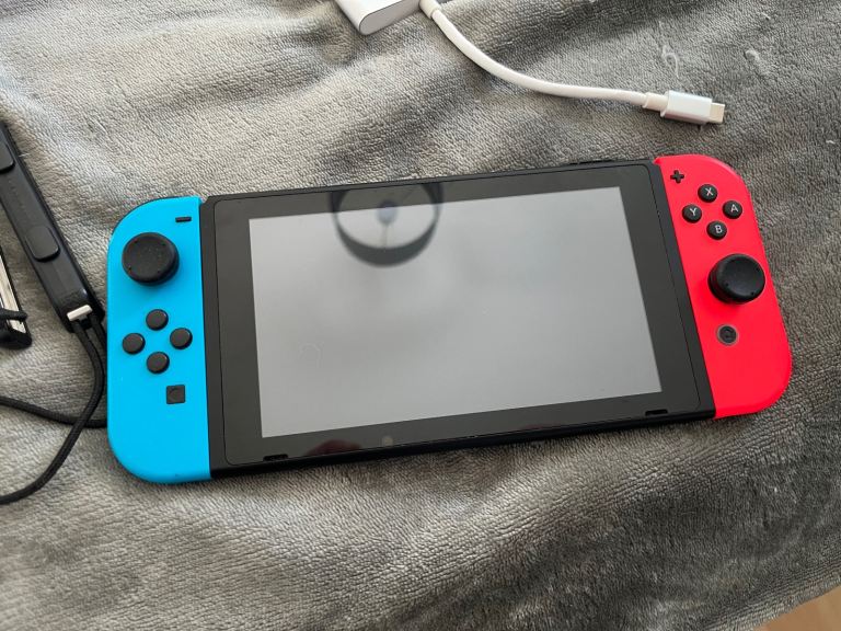 Nintendo switch bundle including Mario cart 8 delux. Comes with charger, adapter to connect to tv, 128gb sd card and steeling wheels. All as seen in the picture.
