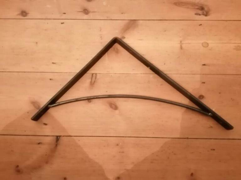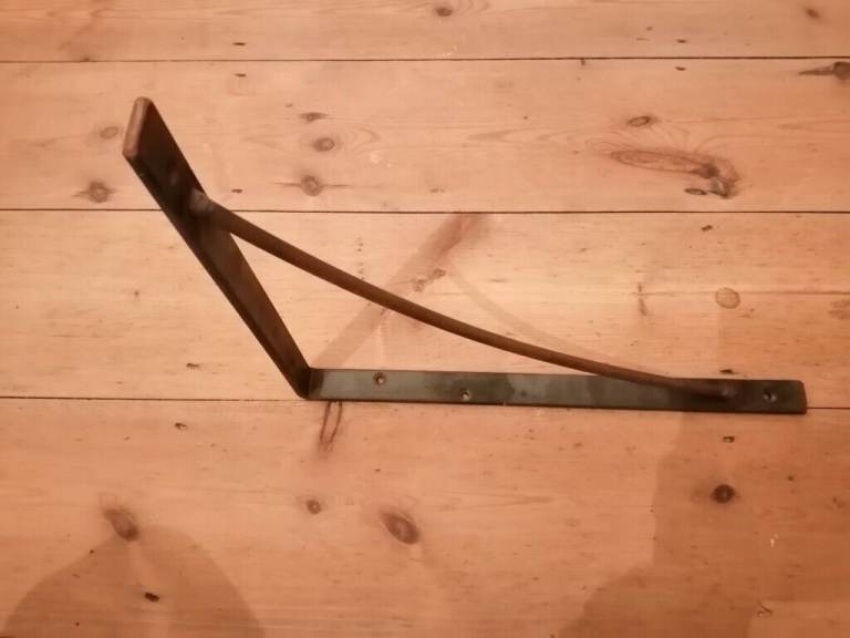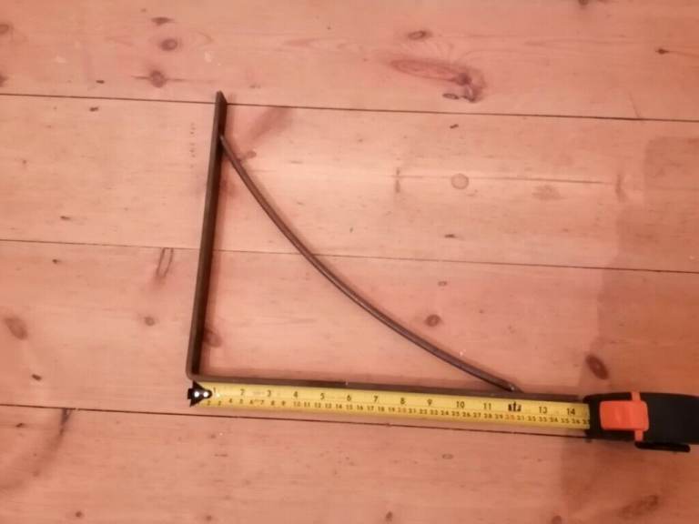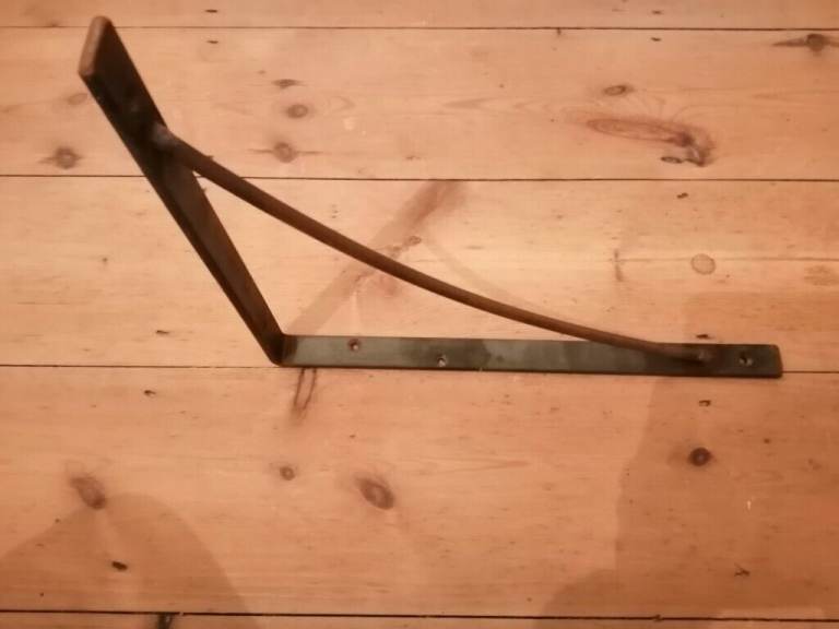 11 wrought iron shelving brackets ideal for an industrial look kitchen. Bracket fixing length 14 inches with a shelving base of 12 inches. Custom made by a local blacksmith but never used.