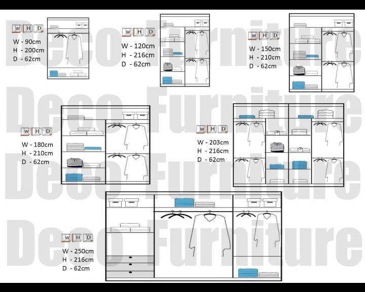 - Size: H=215cm, D=61cm, W=100cm/120cm/150cm/180cm/203cm/250cm
