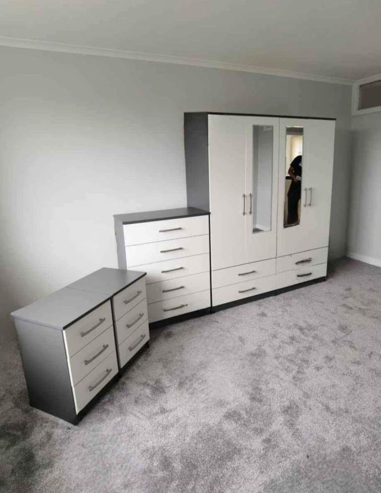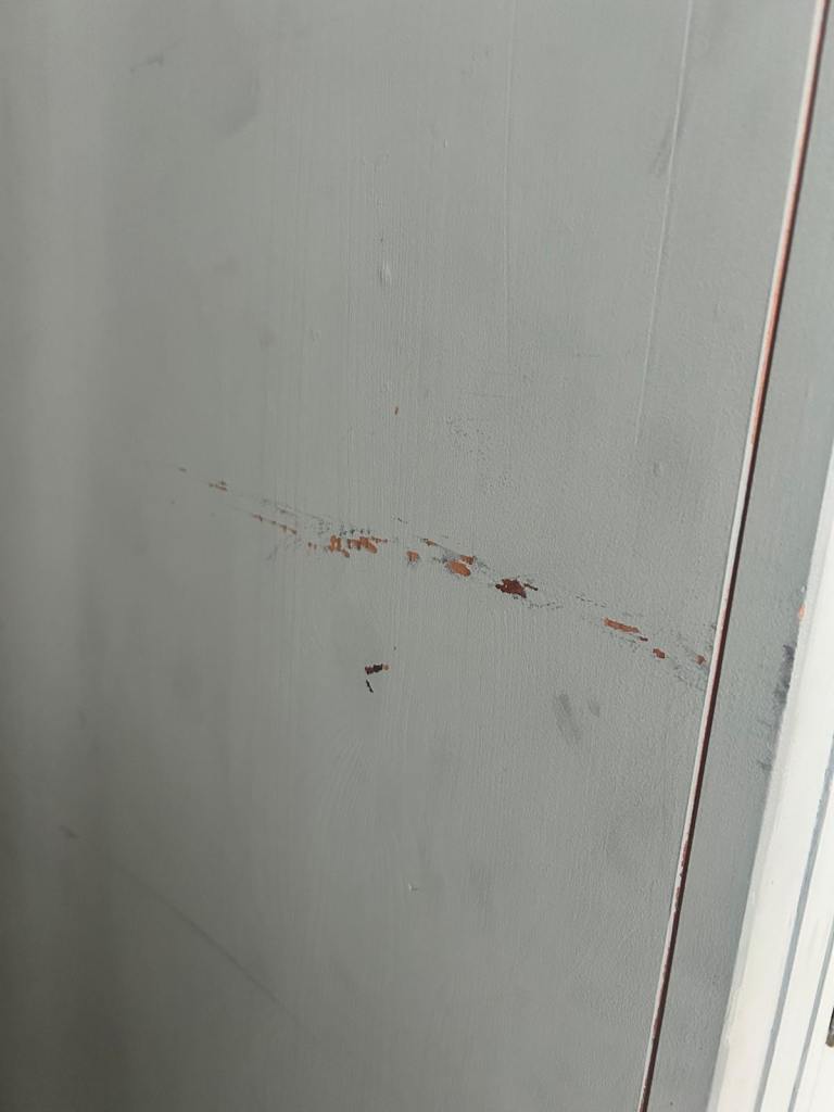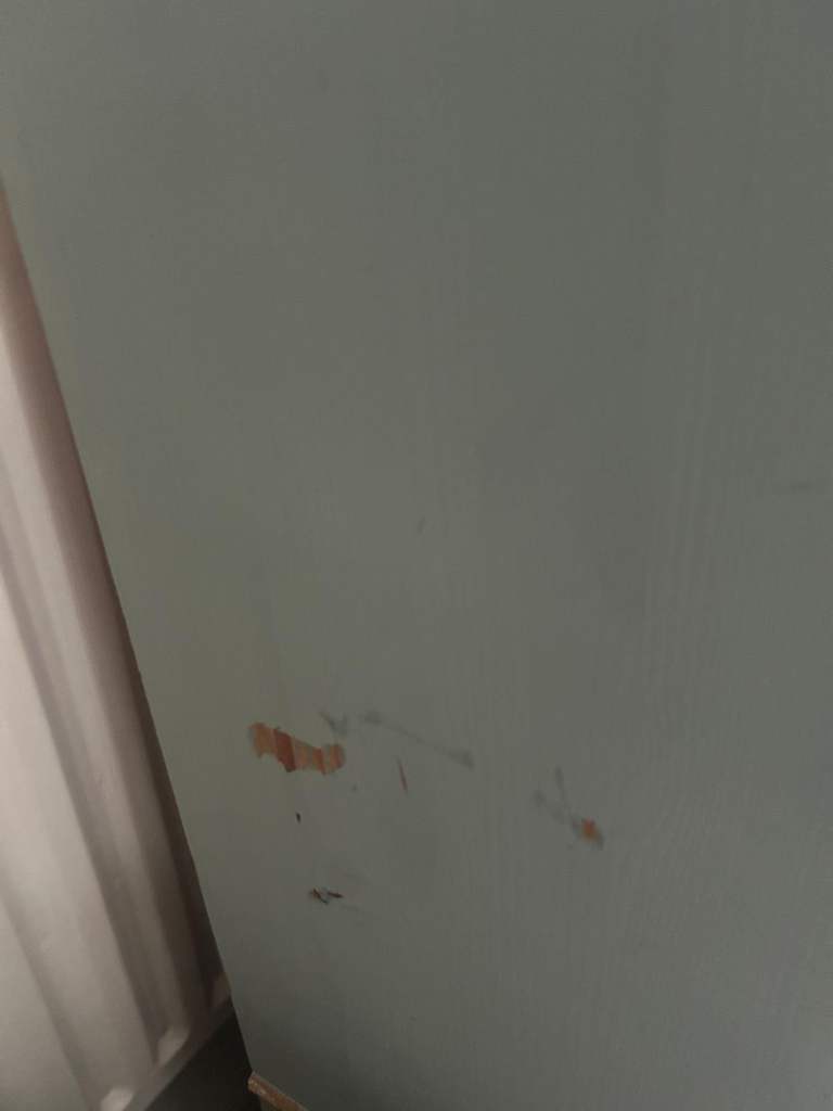 I painted it myself and might need another coat . I have a tub of paint which is included with the price. I replaced the knobs with metallic ones . There are a few scuffs on the paint (please see pics) but apart from that the wardrobe is structurally in excellent condition.