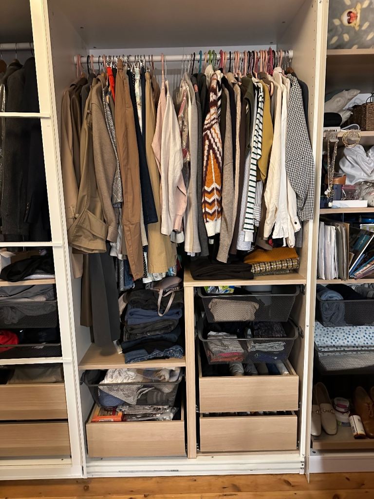 2 large sections with coat hangers and large drawers. Smaller 3rd section with shoe rack and drawers as well as shelves.