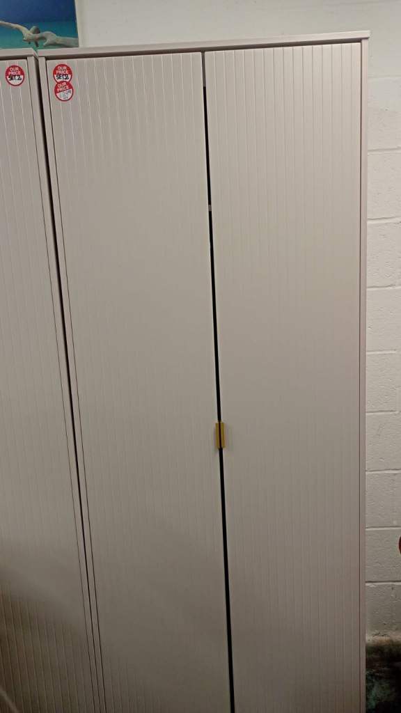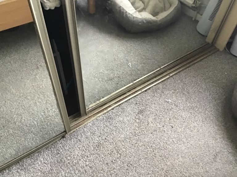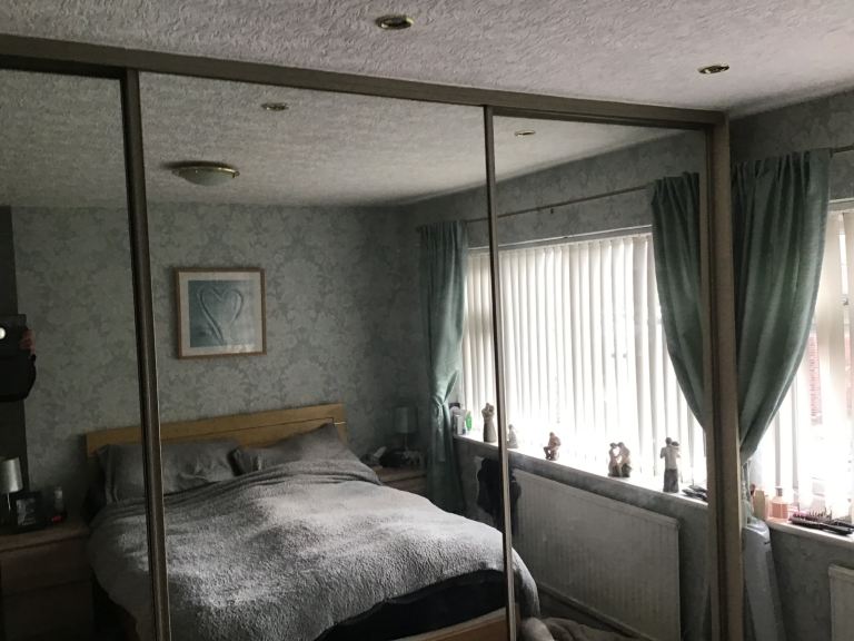 3 sliding wardrobe doors top and bottom track used doors measure 1020 mm wide to suit ceiling hight of 2250 mm x 3010 wide 1 door has small crack at bottom carnt be seen when doors closed or use just 2 to make your own opening all rollers work fine