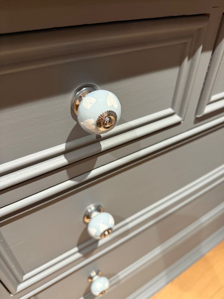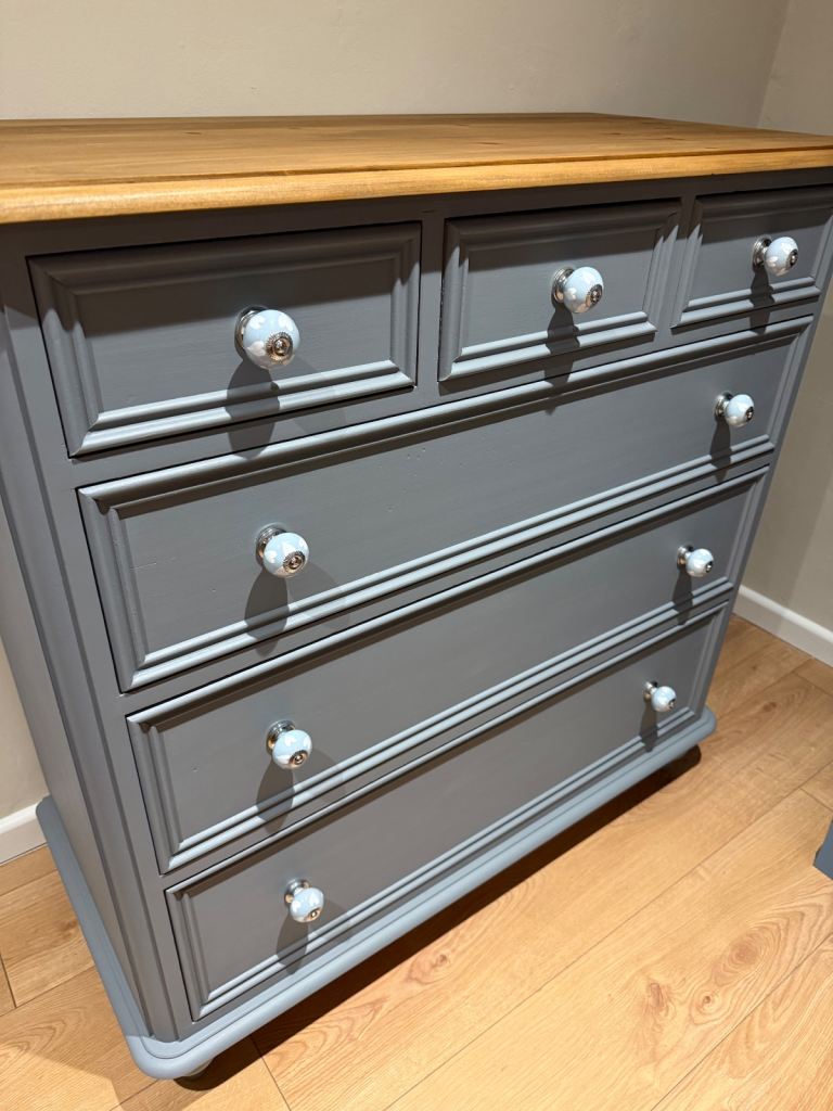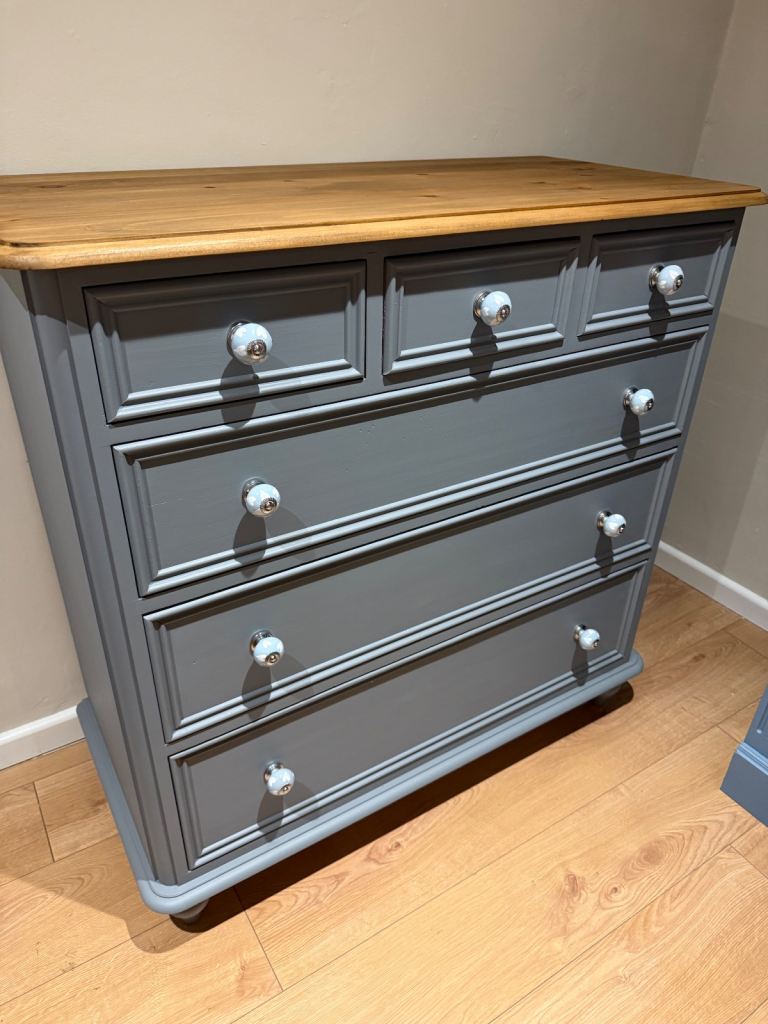 Beautiful Large Chest of Drawers finished & ready to go. Lovely solid set with good deep drawers, solid bases and dovetail joints. Hand Painted in Frenchic Greyhound. The Top has been sanded & waxed using Browning Wax. Finished with pretty heart ceramic knobs.