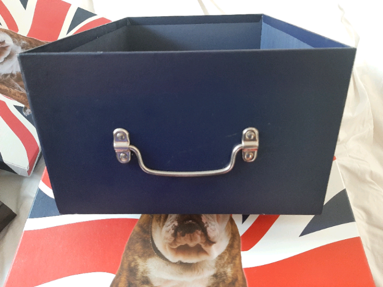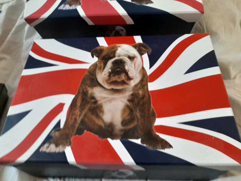 X 2 Sturdy card storage boxes with lids. British Bulldog and Union jack design. 1 box has slight sun fading. Box measurements 35cm length X 24 cm width X 15 cm depth. Smoke and pet free home. Buyer to collect please BD12 8DL. £5.00 for both boxes.