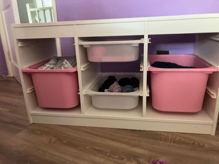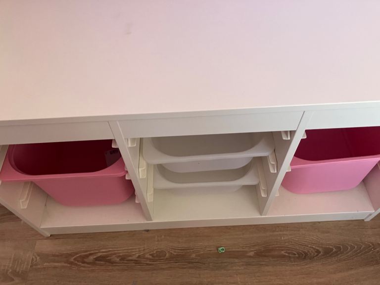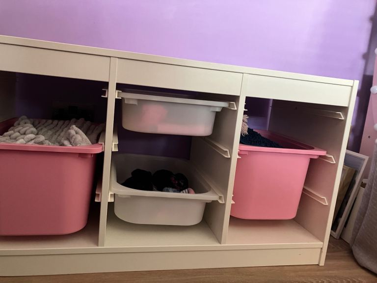 White storage unit with 2 large pink drawers and 2 smaller ones , more can be added if required . Ooops one photo makes one pink storage box look wonky but it’s my photo skills 🤣🤣