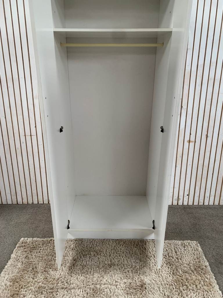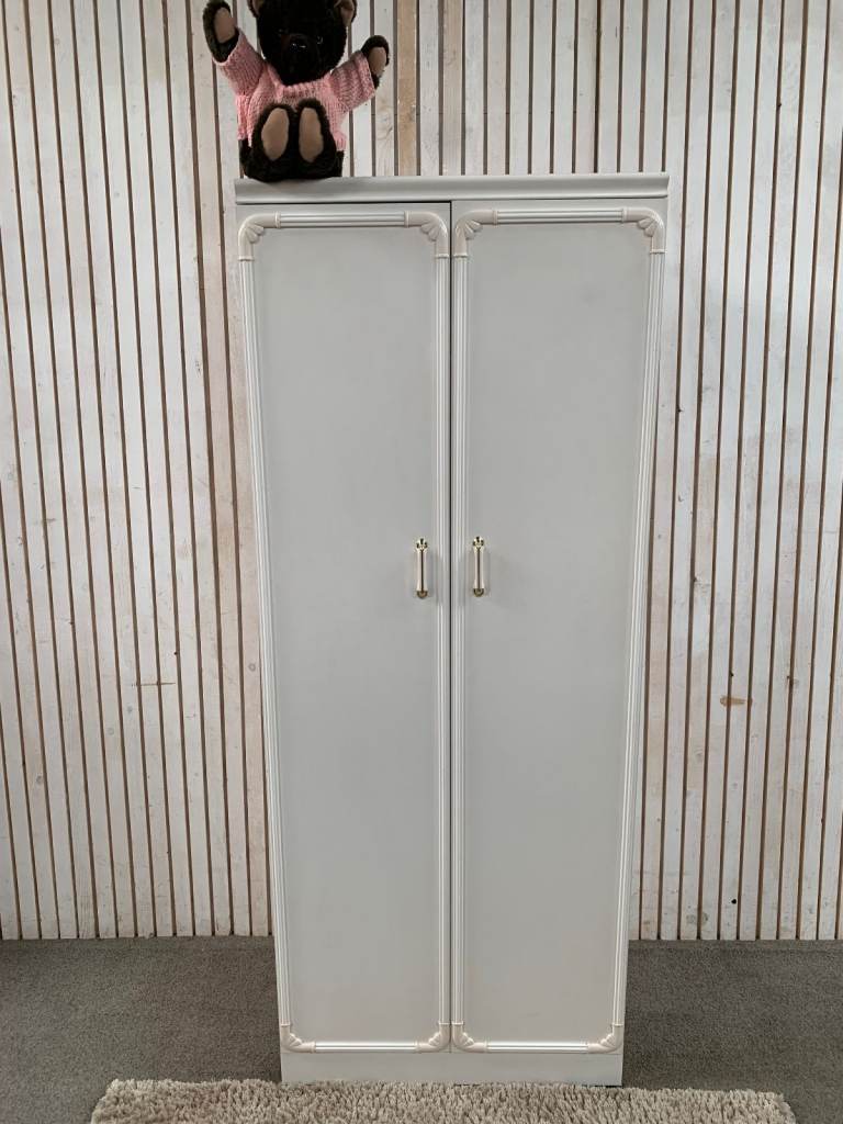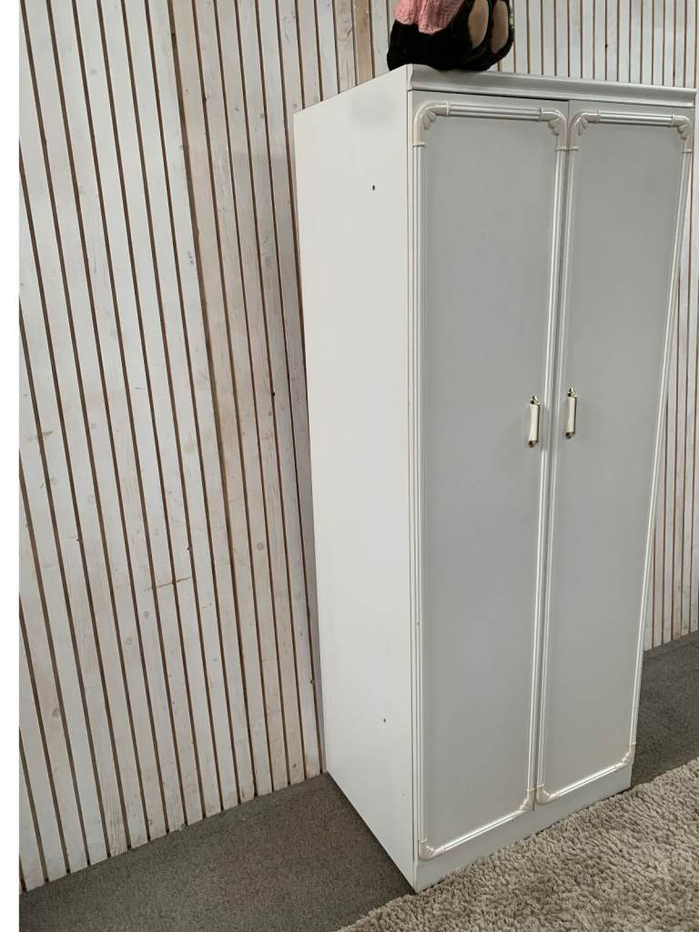 The white vintage wardrobe is a stylish addition to any retro-themed bedroom. This freestanding wardrobe has two hinged doors, a hanging rail for clothes, and a shelf on top for accessories or shoes. Made from MDF/chipboard, it stands at a height of 192cm with a length of 76cm and a width of 53.5cm. The sleek white colour adds a touch of elegance to the room while providing ample storage space for clothing and accessories. Perfect for those looking for a space-saving and stylish wardrobe option.(508)