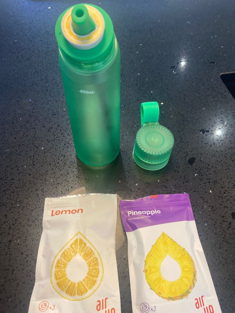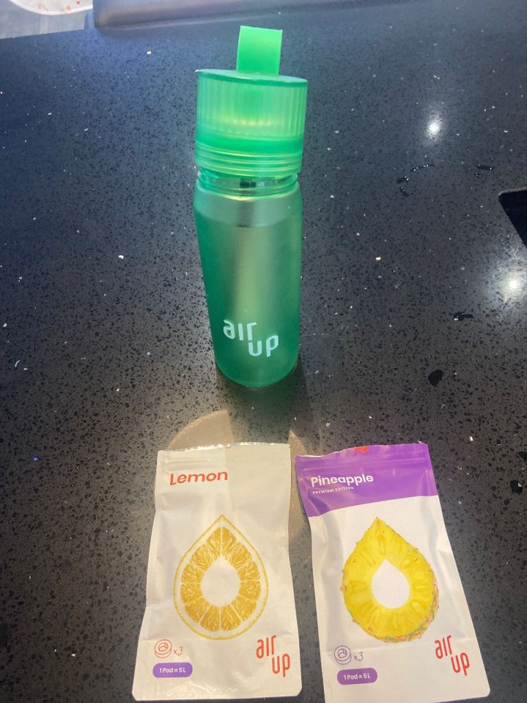 Barely used genuine green AirUp water bottle with pineapple and lemon pods.