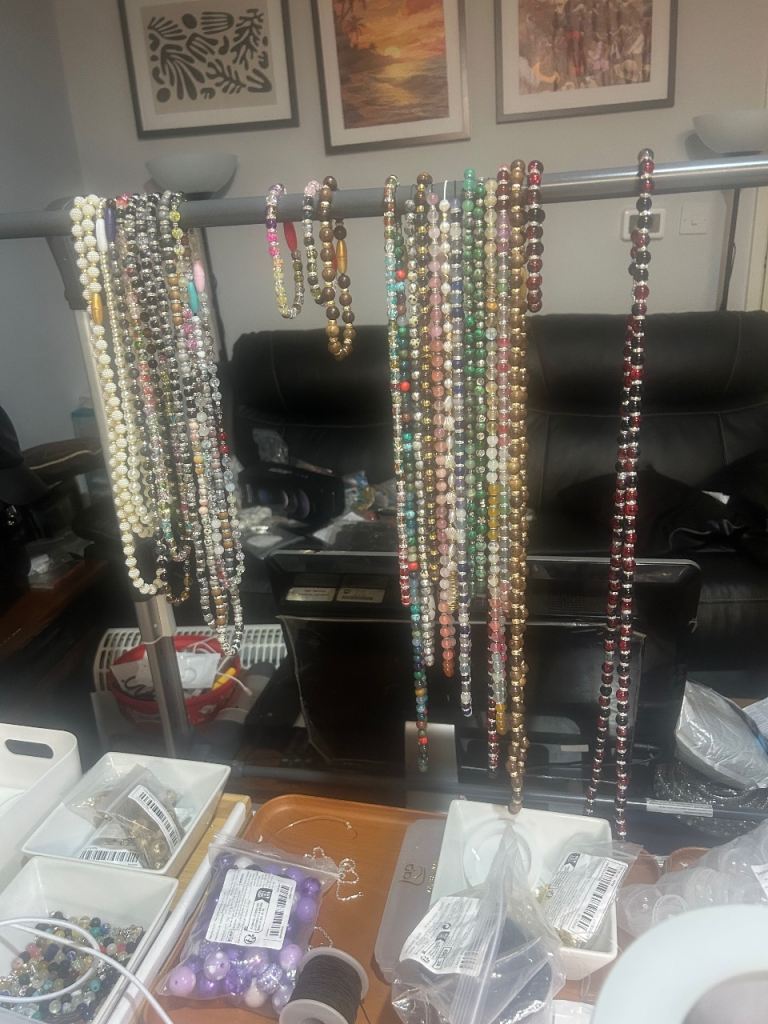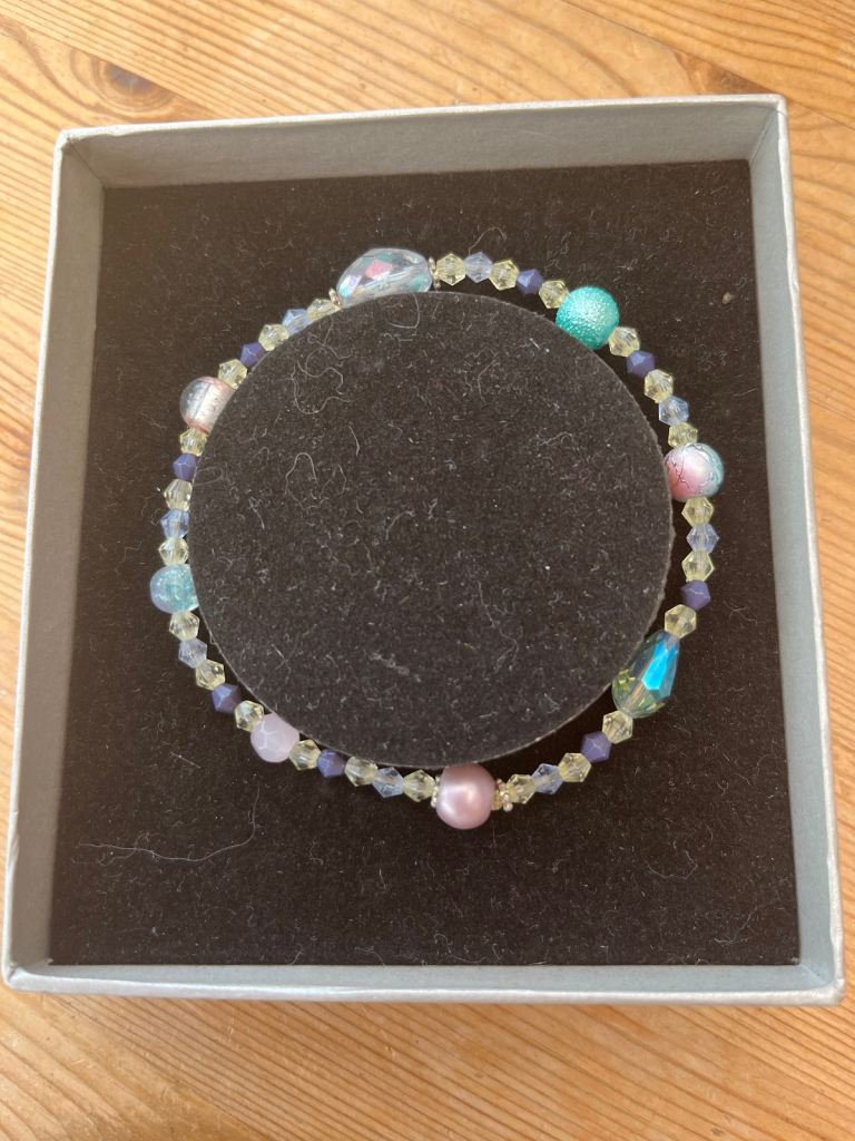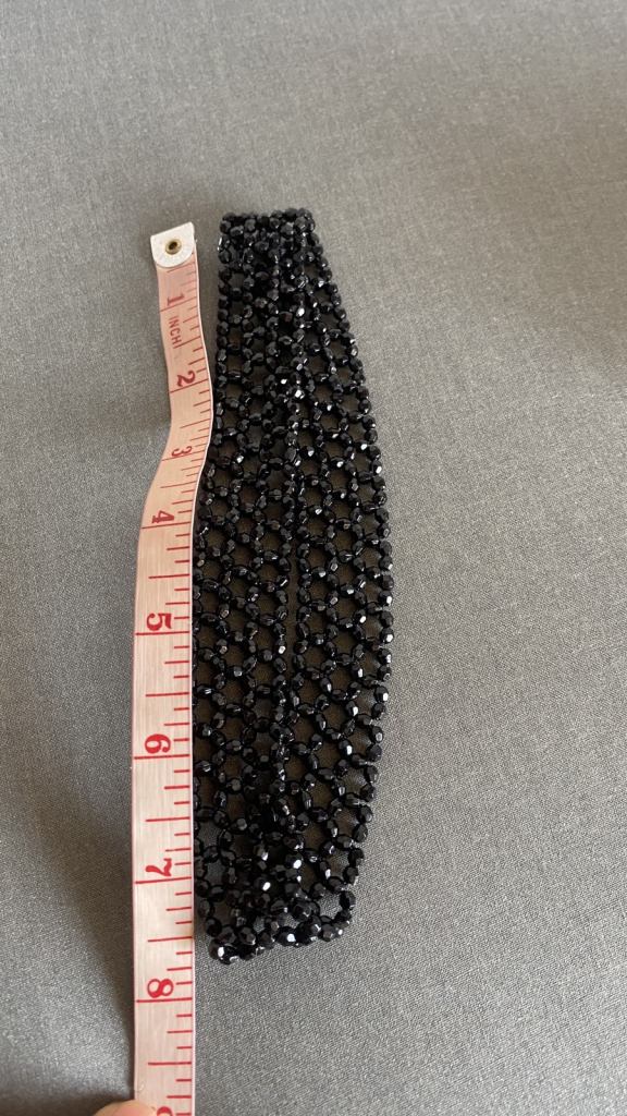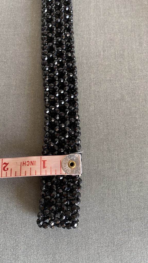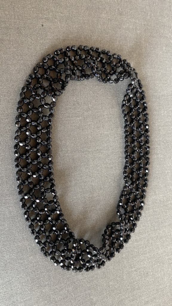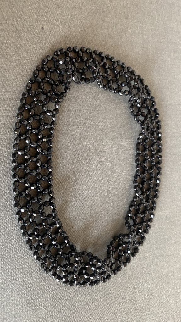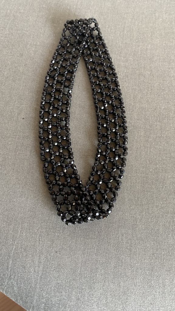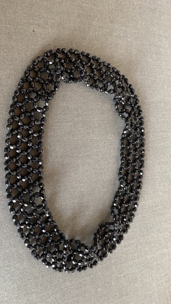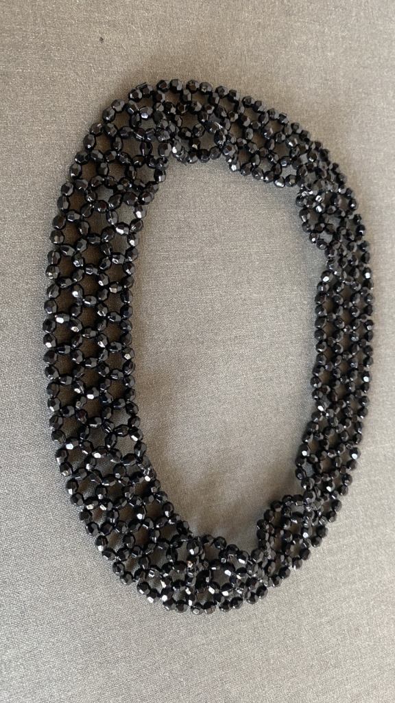 Black beaded necklace, approx 7 inches long, made of small black beads woven into a delicate pattern. Could be used as a choker or a bracelet.